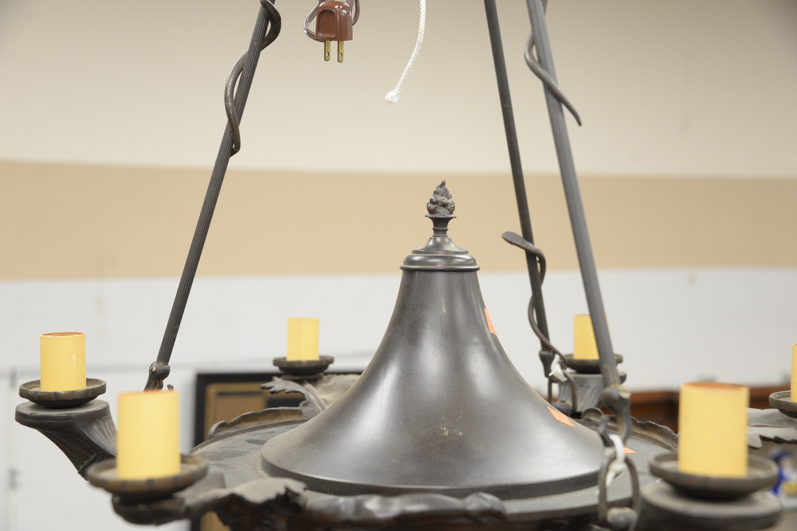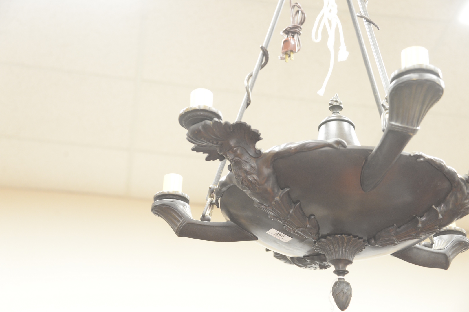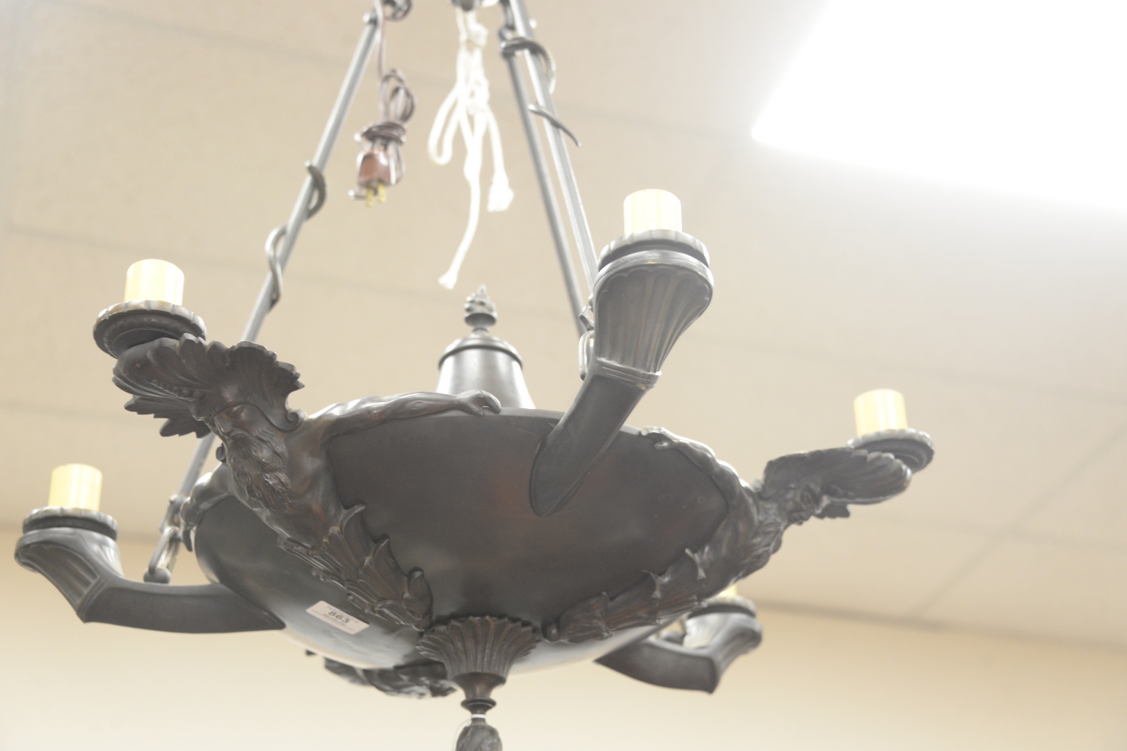 Lot 863: French Empire Style Hanging Light, having six lights, three having figural supports, diameter 26 inches.