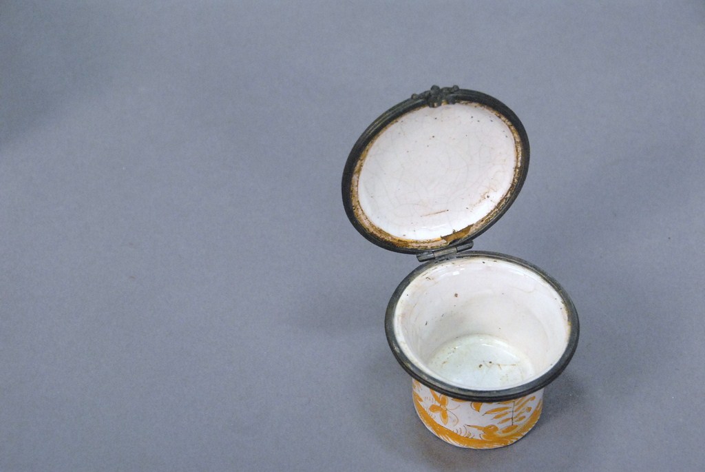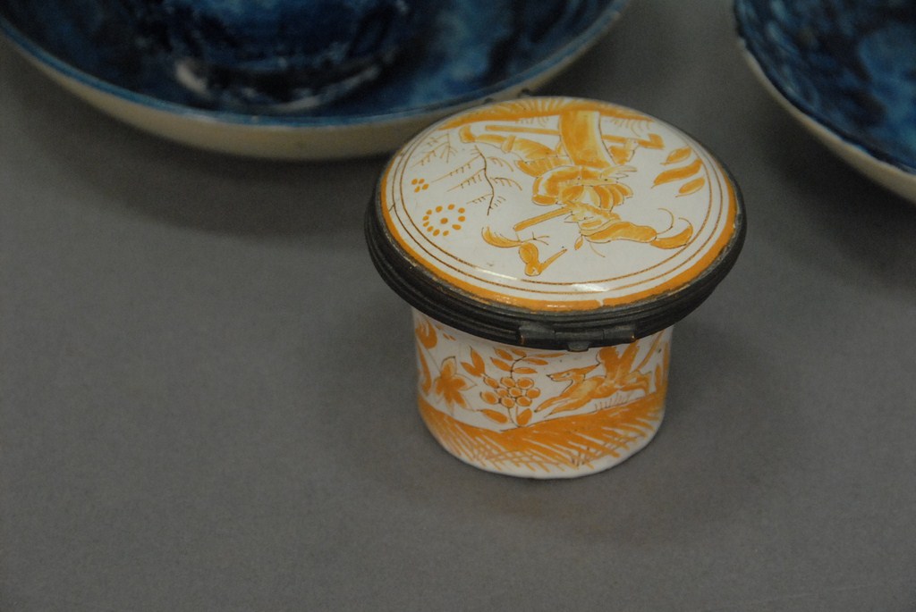 Lot 868: Six piece lot pair of Staffordshire blue and white cups and saucers, and French Faience covered jars.