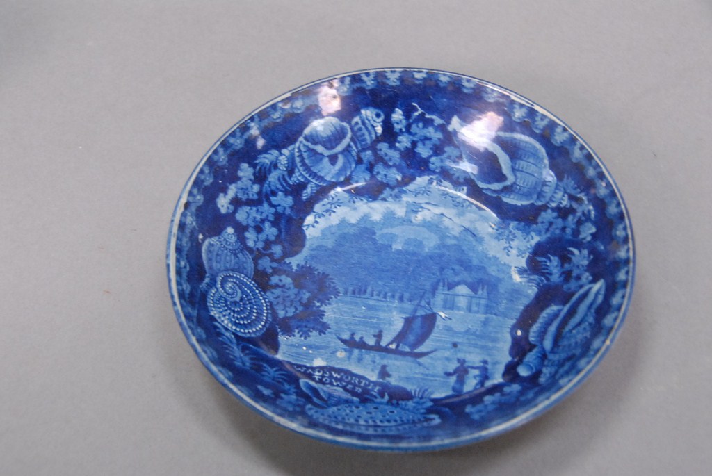 Six piece lot pair of Staffordshire blue and white cups and saucers, and French Faience covered jars.