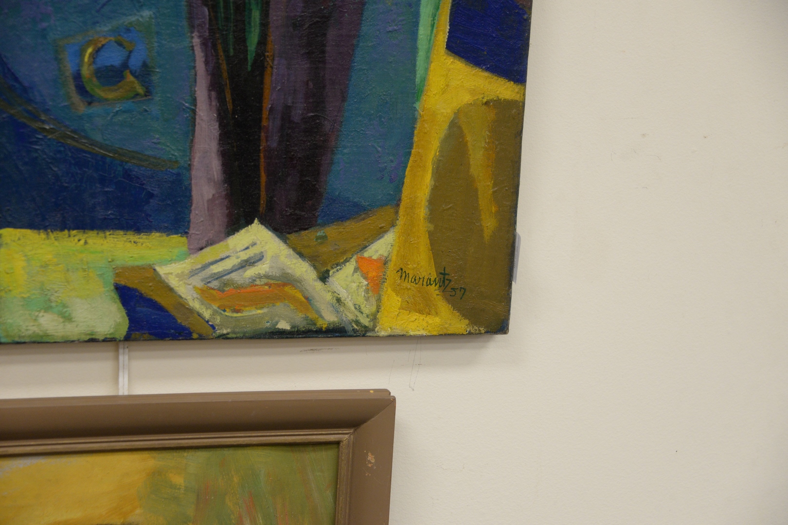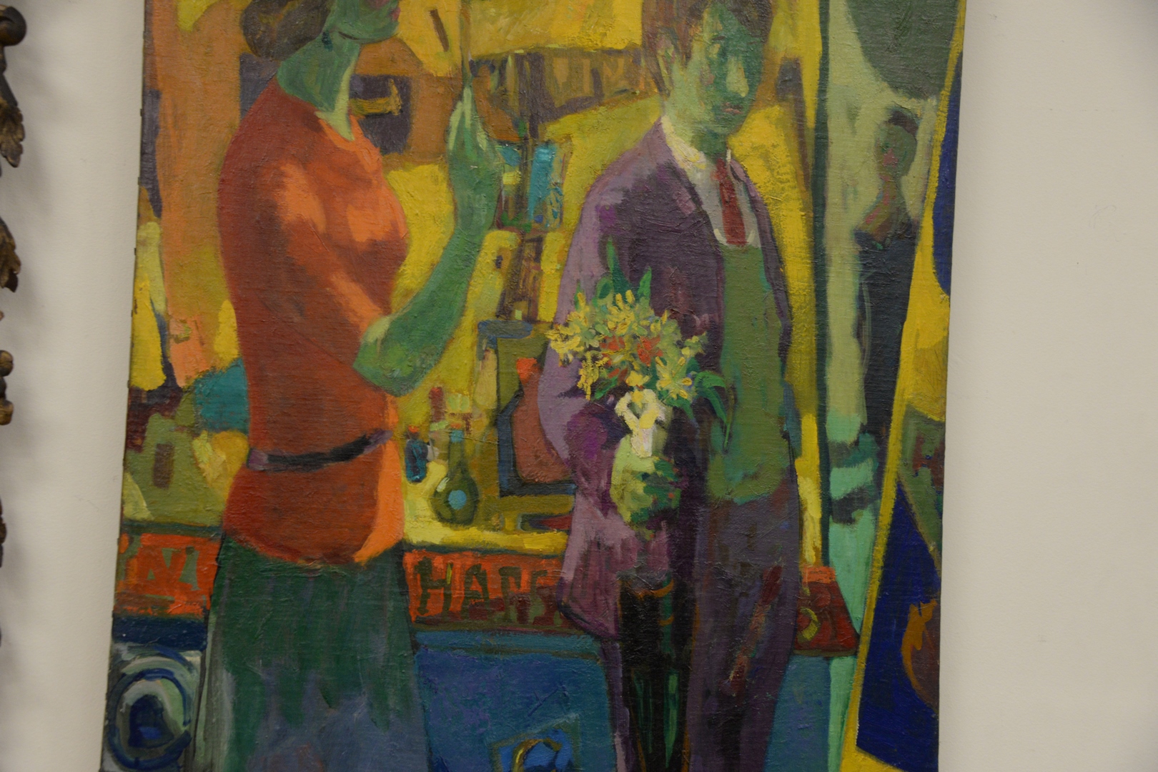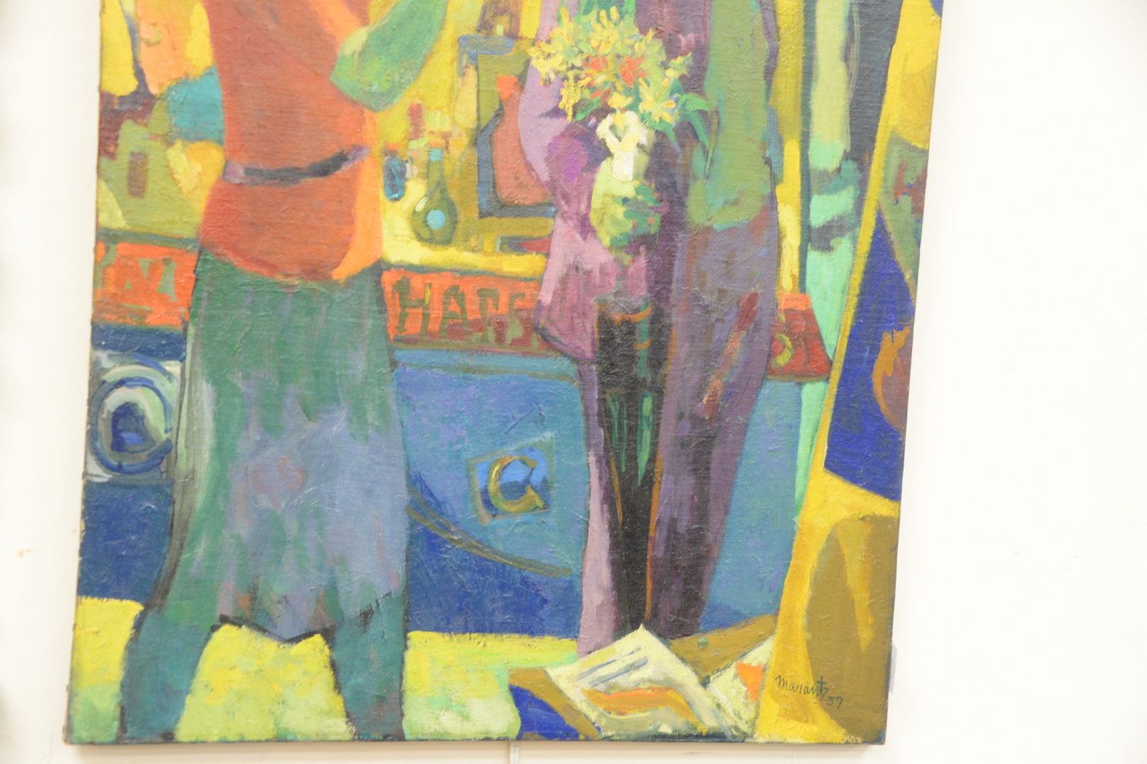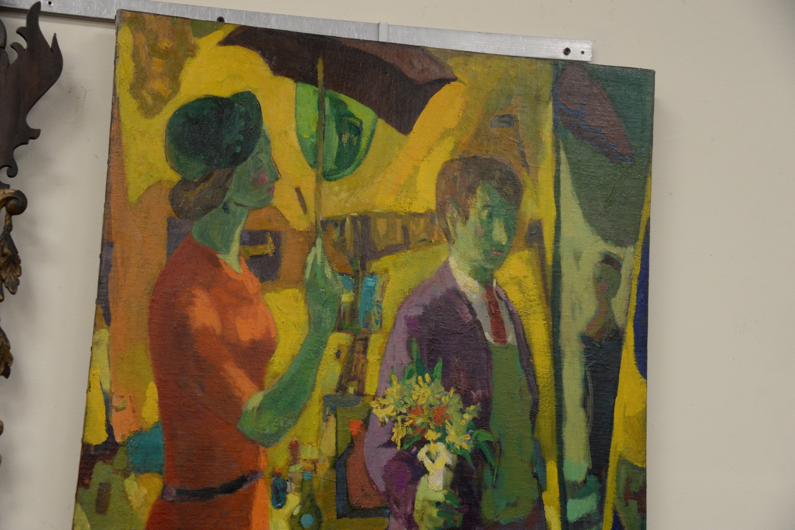 Lot 869: Irving Marantz American, 1912 – 1972, Young Couple with Flowers, oil on relined canvas, signed and dated lower right Marante 57…