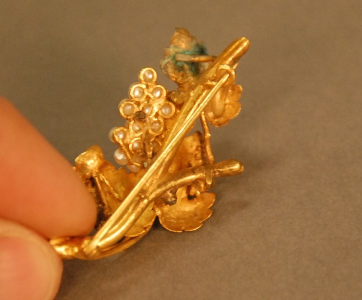 Lot 87: 14K Victorian grape leaf pin set with pearls one leaf is loose, but available. lg. 1 3/4in. 6.5 grams
