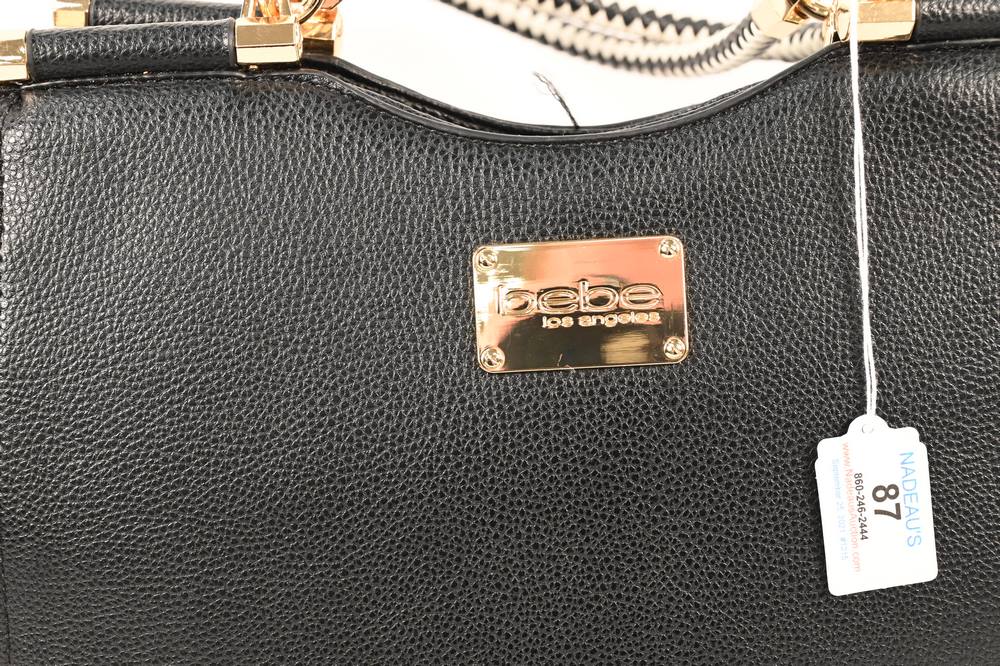 Lot 87: Bebe Black Leather Handbag, having single compartment, three interior pockets, gold tone hardware, black/white leather woven handles…