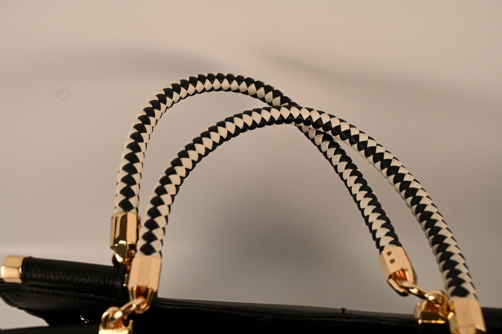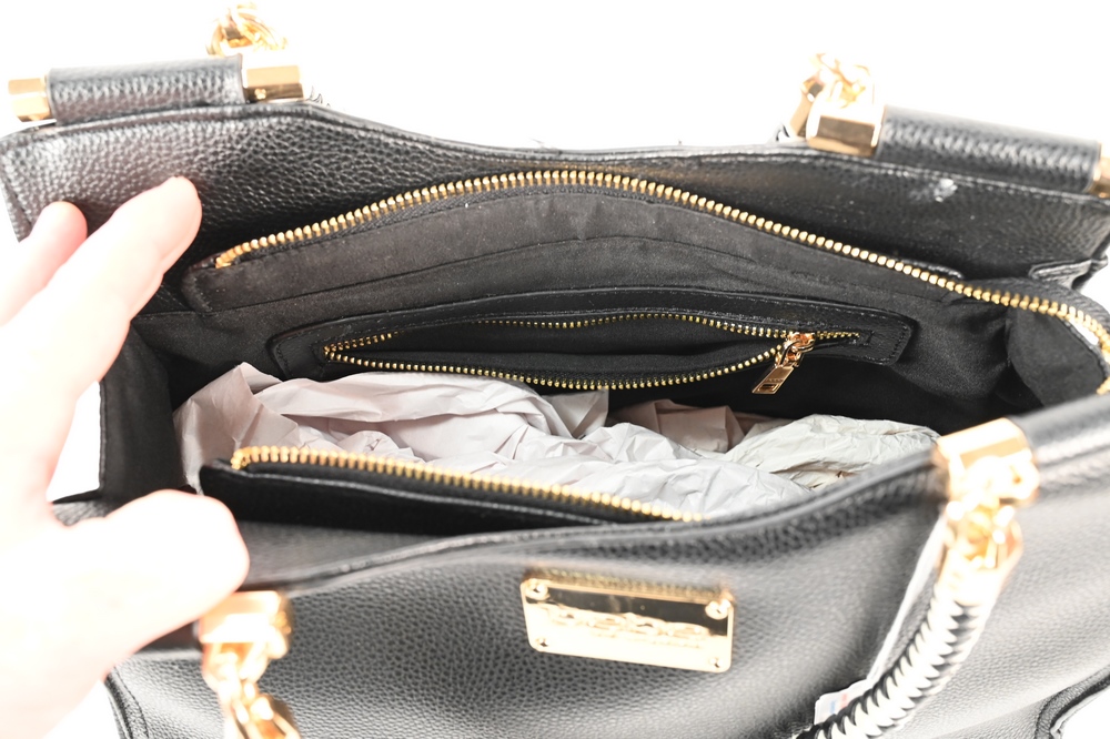 Bebe Black Leather Handbag, having single compartment, three interior pockets, gold tone hardware, black/white leather woven handles, in good pre-owned condition.