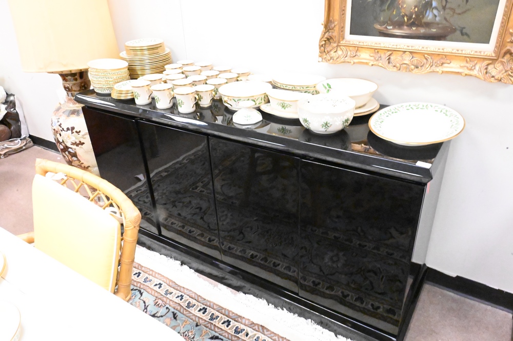 Lot 87: Black Lacquered Credenza, having four doors and three interior drawers, height 33 1/2 inches, top 20″ x 67″.
