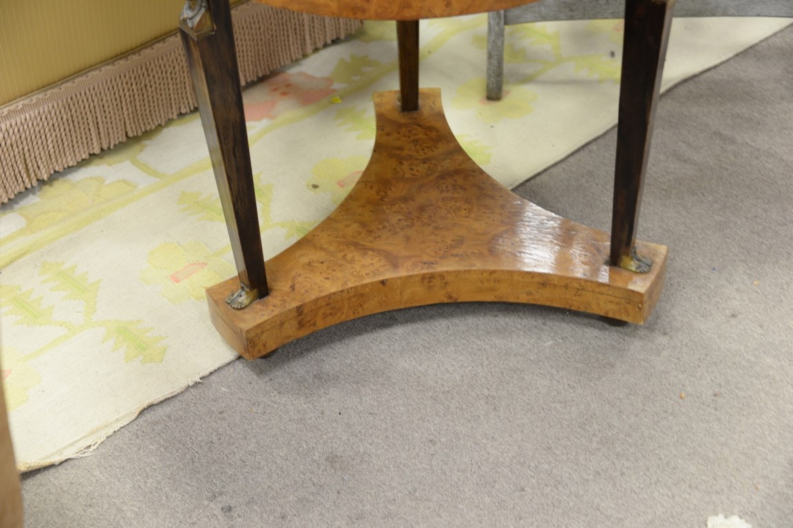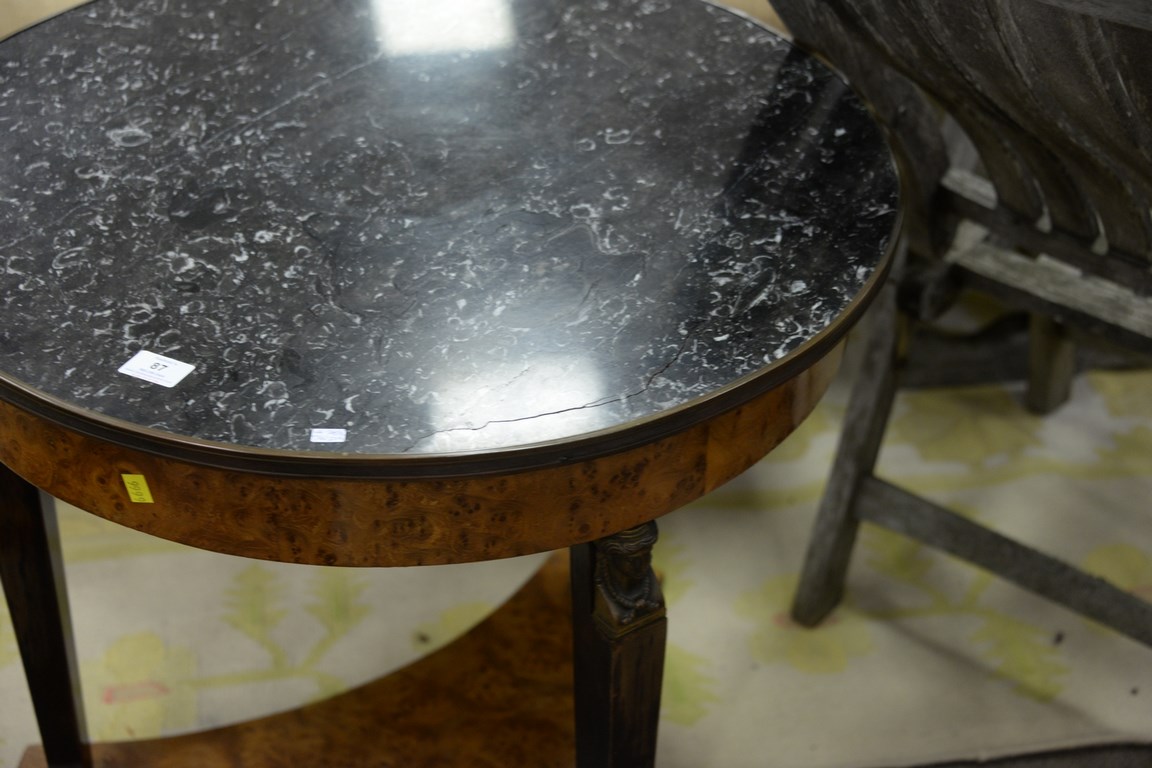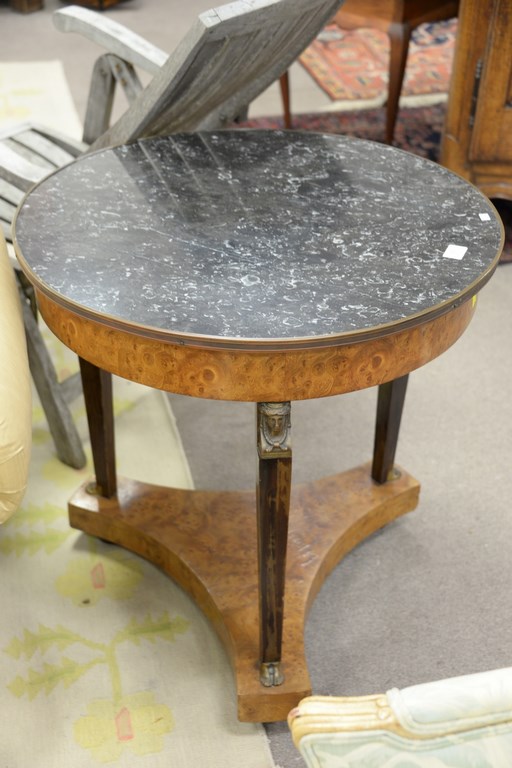 Lot 87: Continental style burlwood style marble top table mounted with brass faces and brass feet. ht. 28 1/2 in. top: 27 1/2