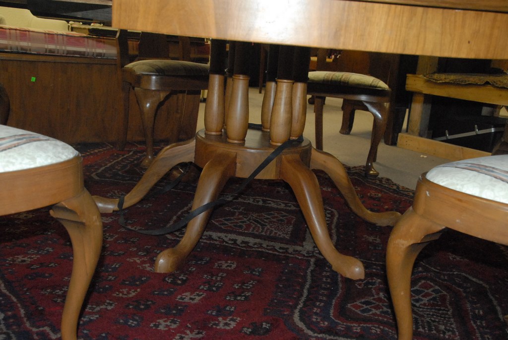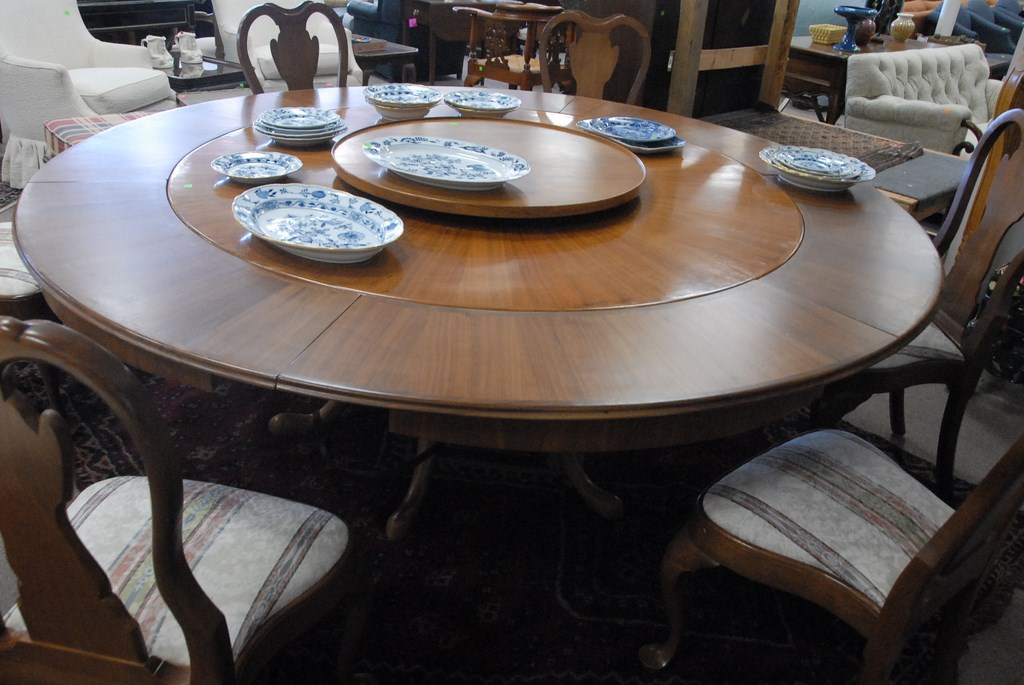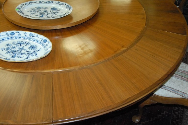 Lot 87: Custom handmade walnut round dining table with six extra leaves to make larger round along with custom center lazy susan and custom …