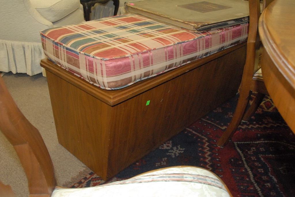 Custom handmade walnut round dining table with six extra leaves to make larger round along with custom center lazy susan and custom bench/cabinet to hold leaves, closed: dia. 60in. open: dia. 84in.