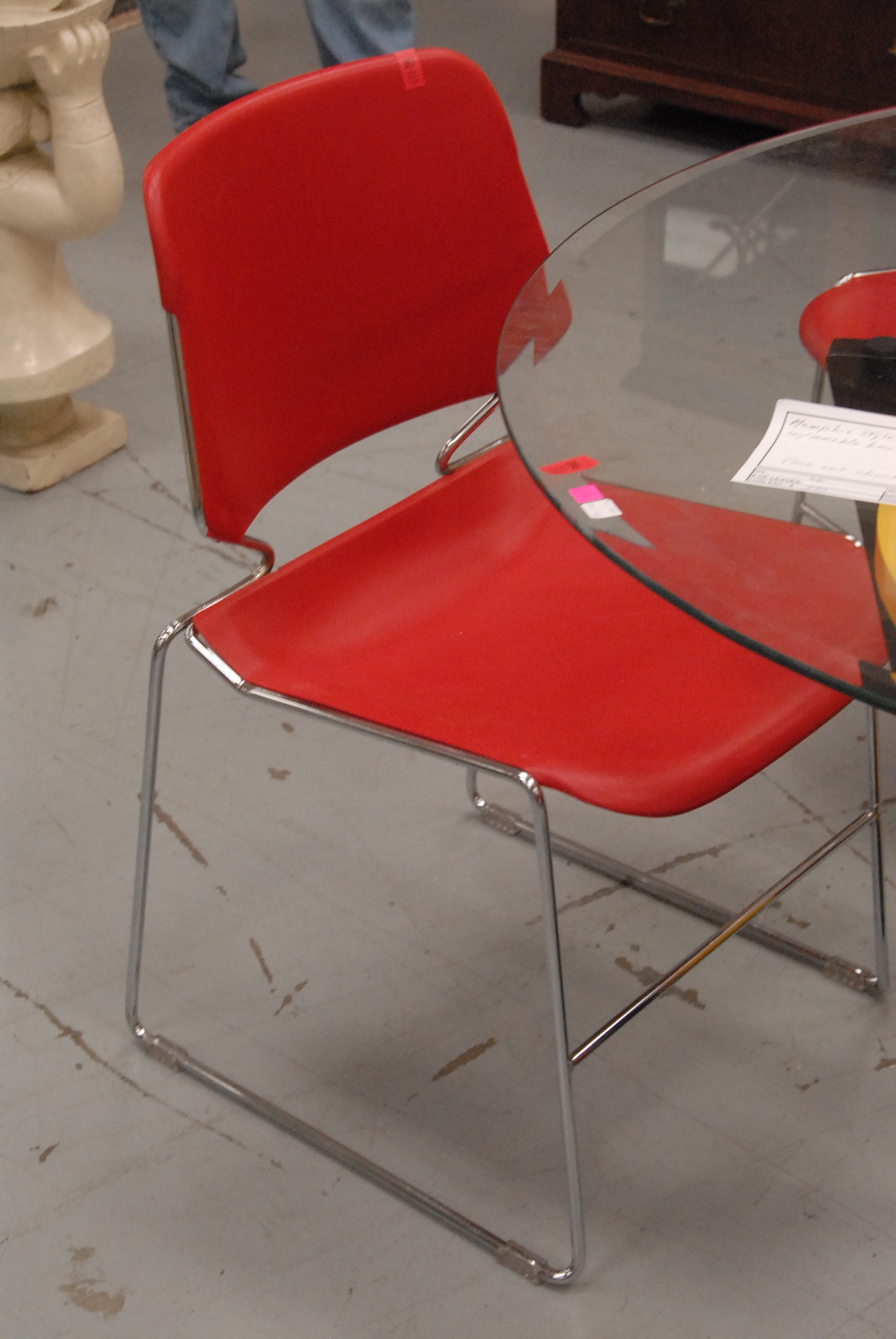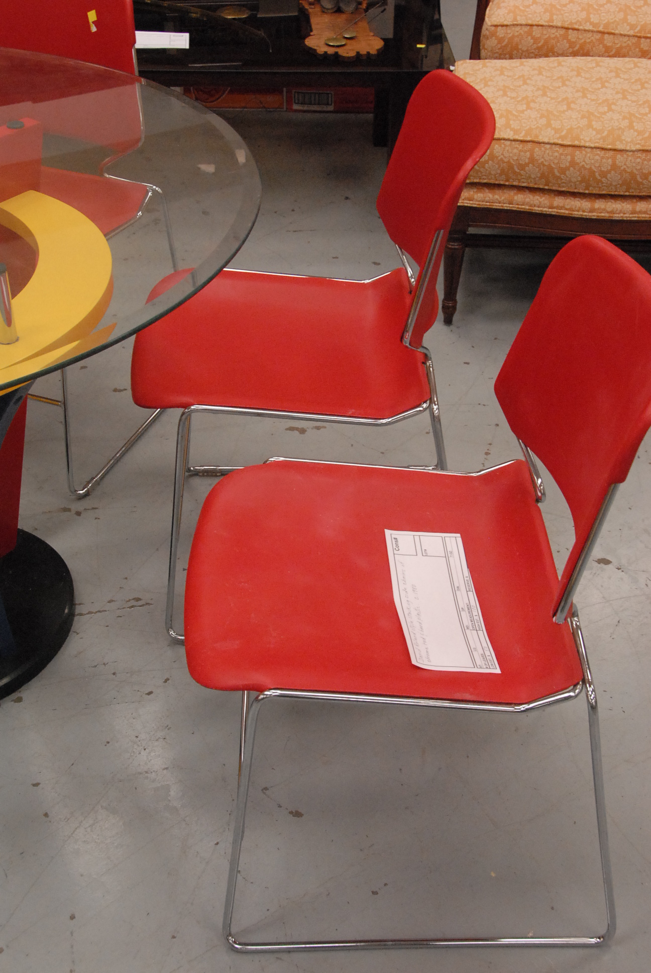 Lot 87: Five David Roland style stacking side chairs of chrome rod and hard plastic circa 1980.