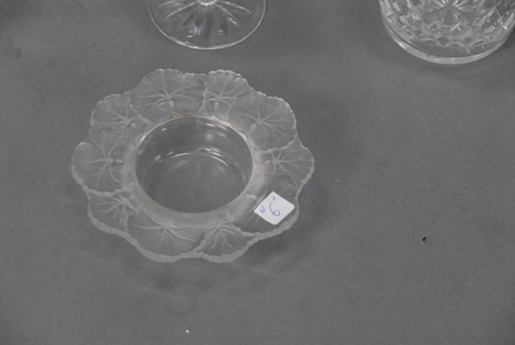 Lot 87: Four piece lot to include three pieces of Waterford a decanter, pitcher, and castor and Lalique frosted dish dia. 6.