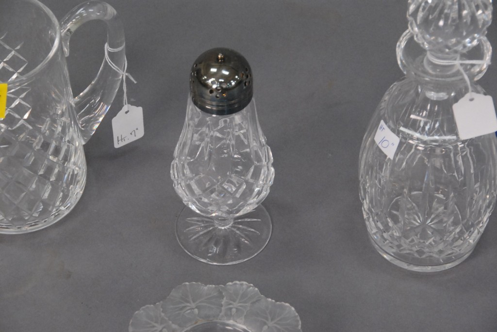 Four piece lot to include three pieces of Waterford a decanter, pitcher, and castor and Lalique frosted dish dia. 6.