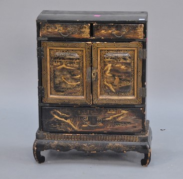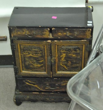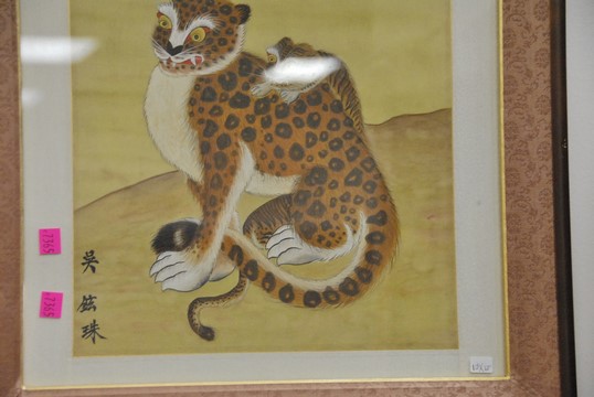 Lot 87: Group of seven Oriental pieces to include six embroideries and a watercolor on silk of a cat along with an Oriental small cabinet.