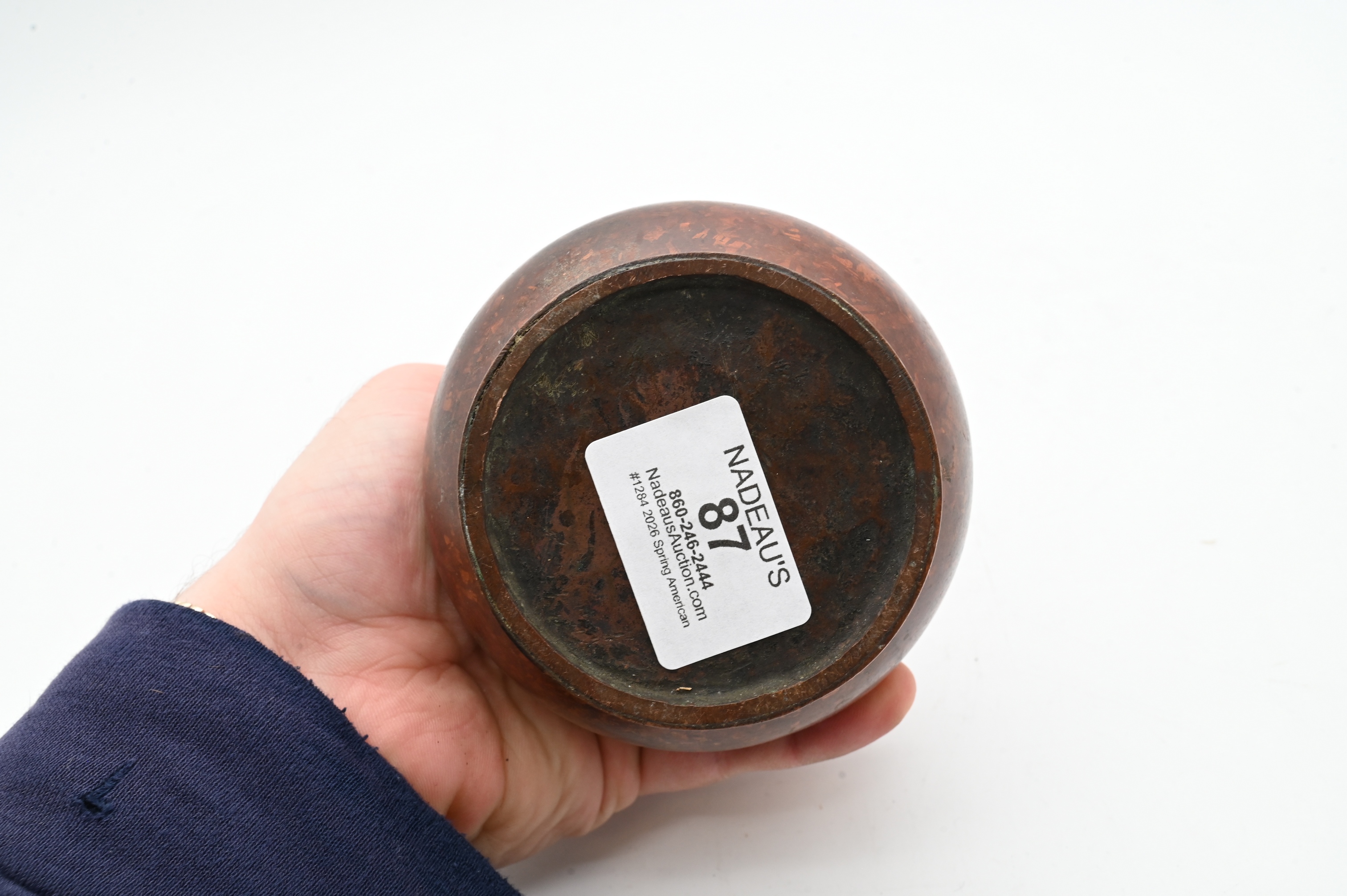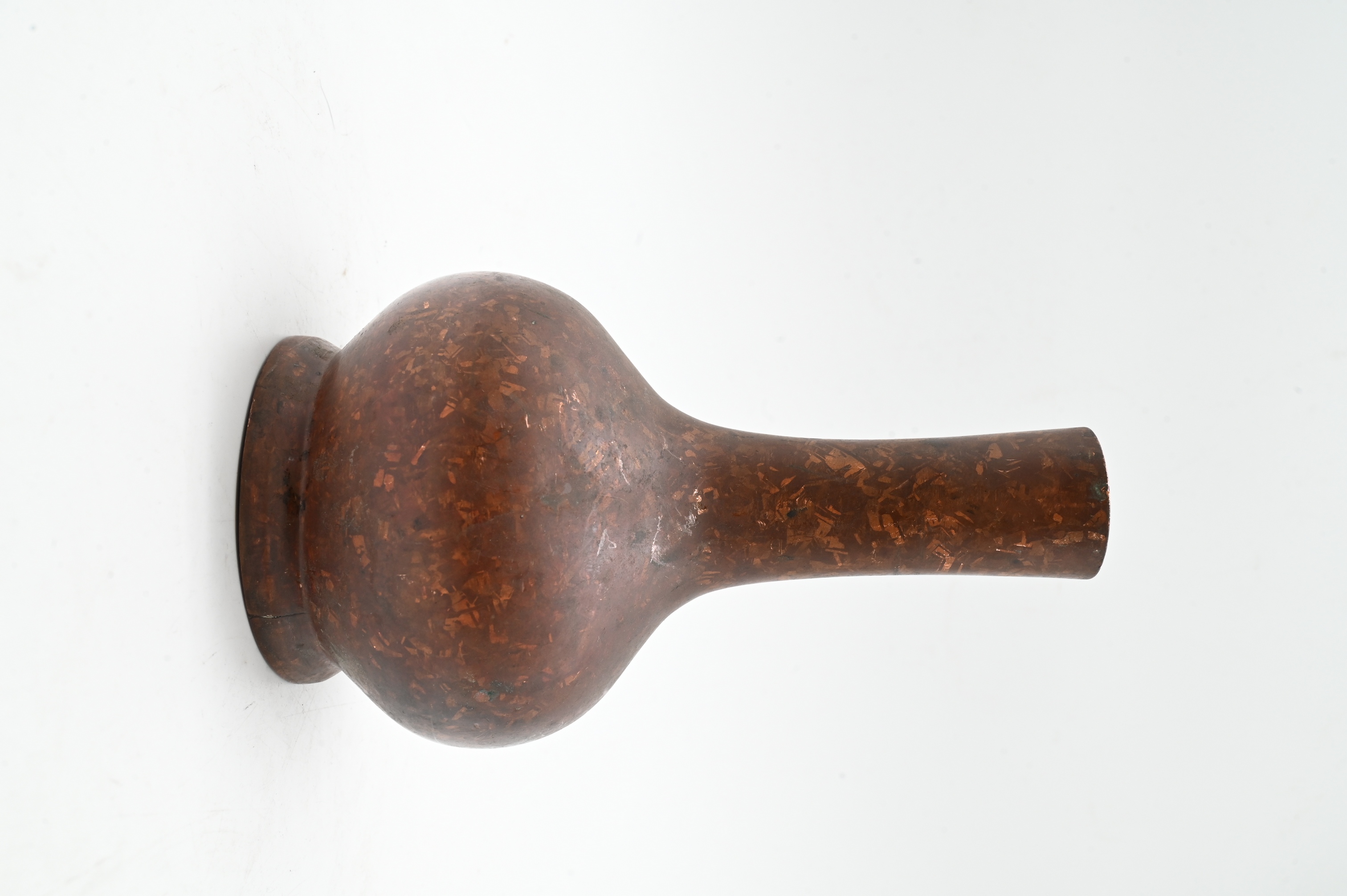 baluster-form copper vase with long neck, showing natural flecking within the metal and surface wear consistent with age.