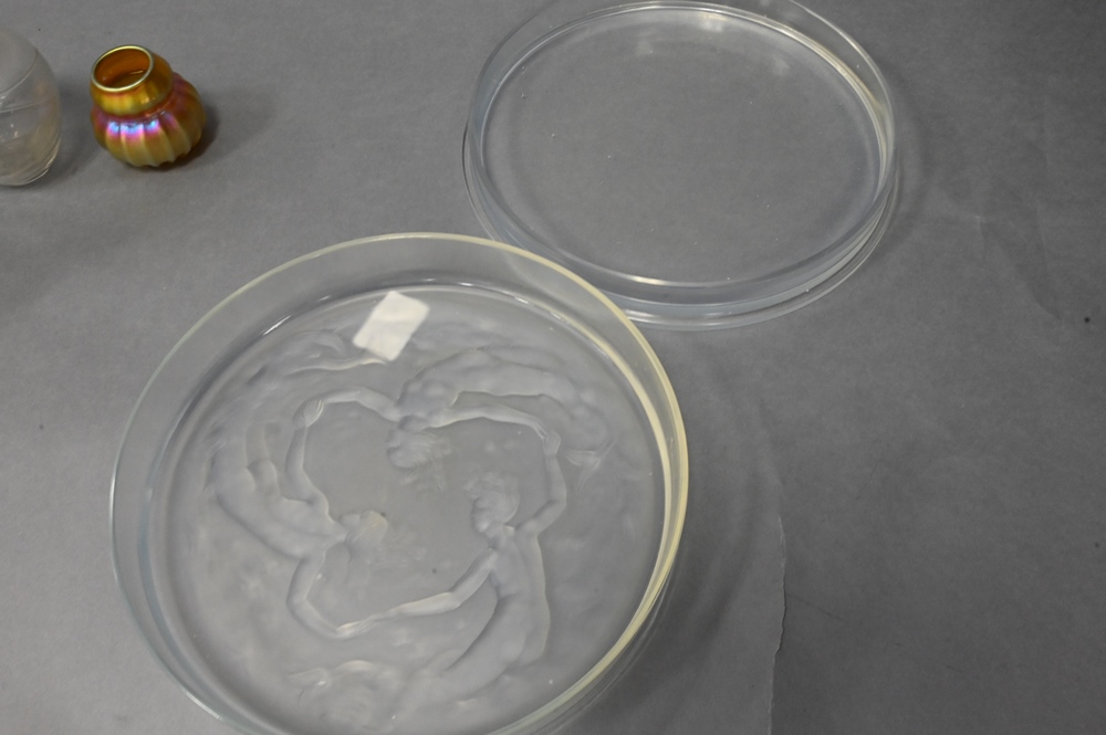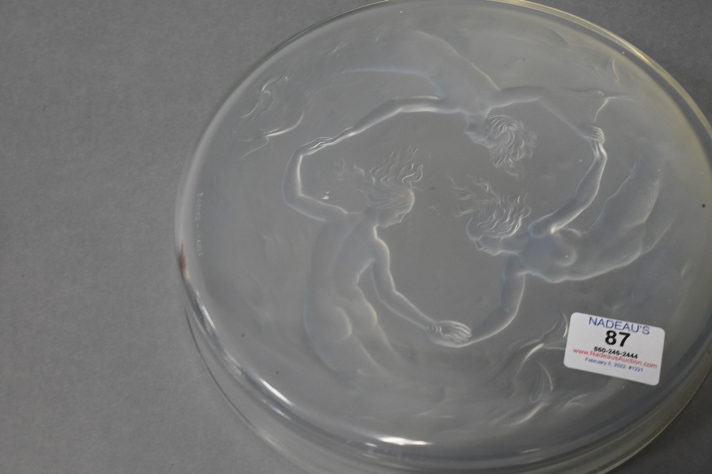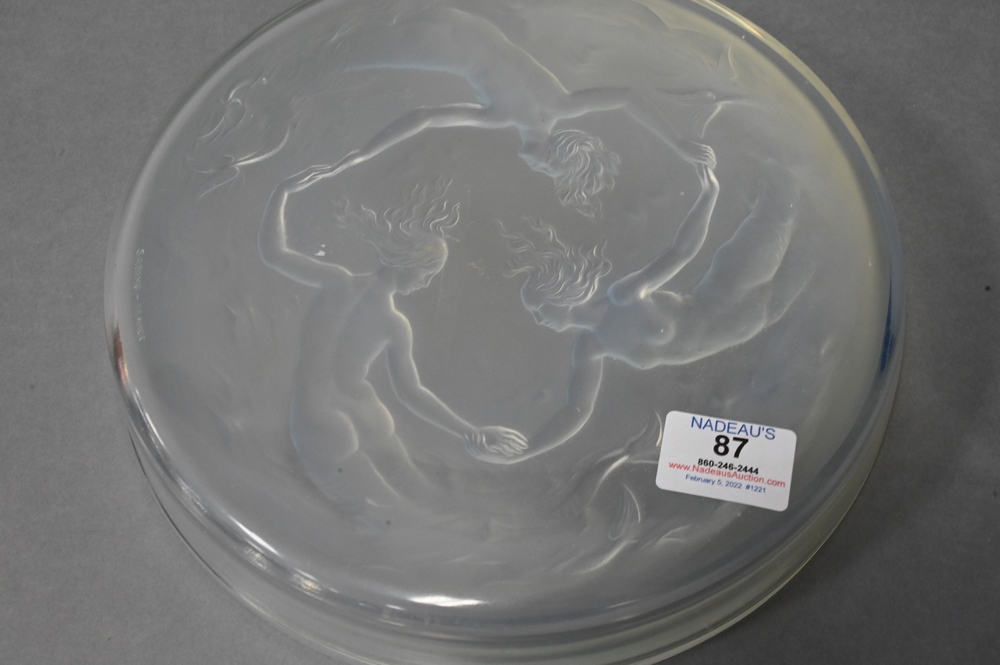 Lot 87: Large Sabino Art Deco Covered Dish, frosted glass top with three nude mermaids, diameter 10 inches.