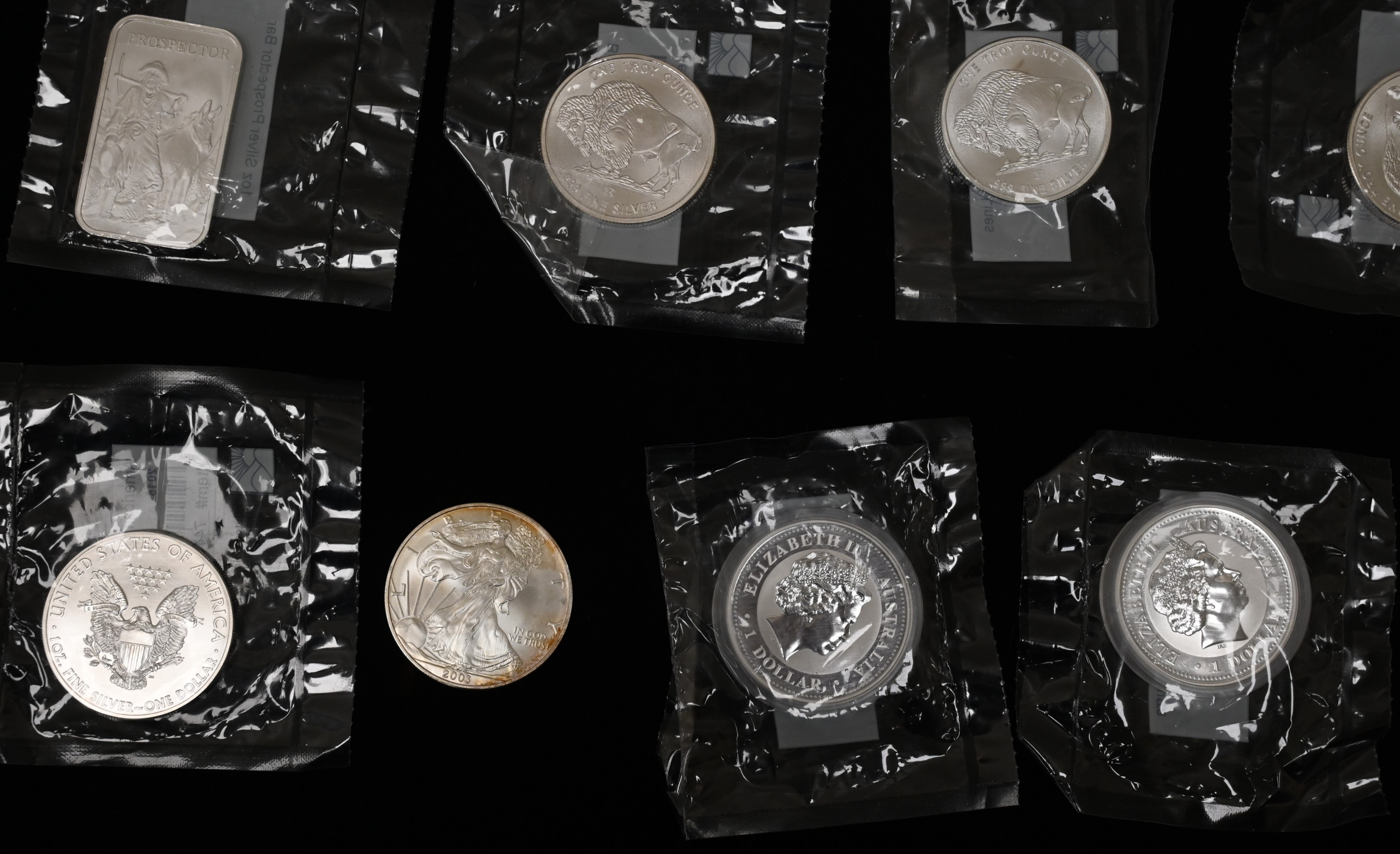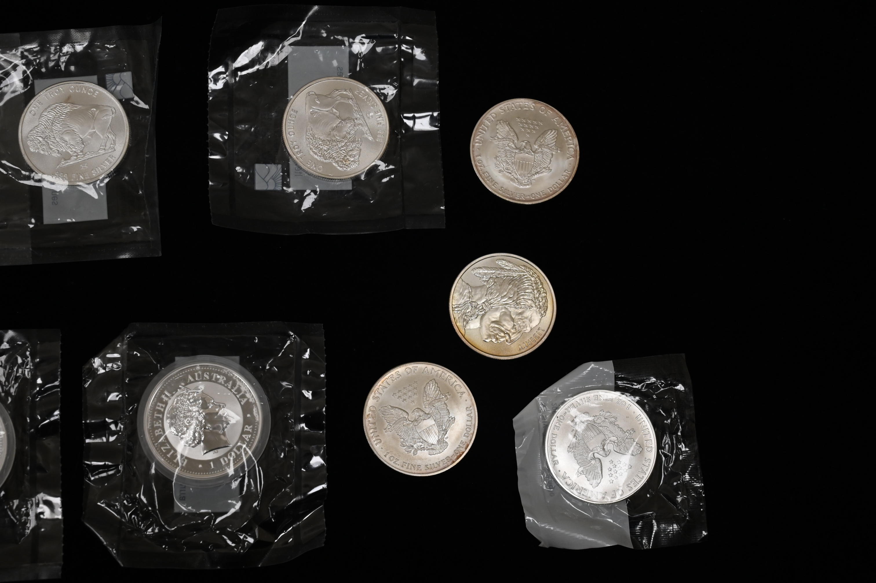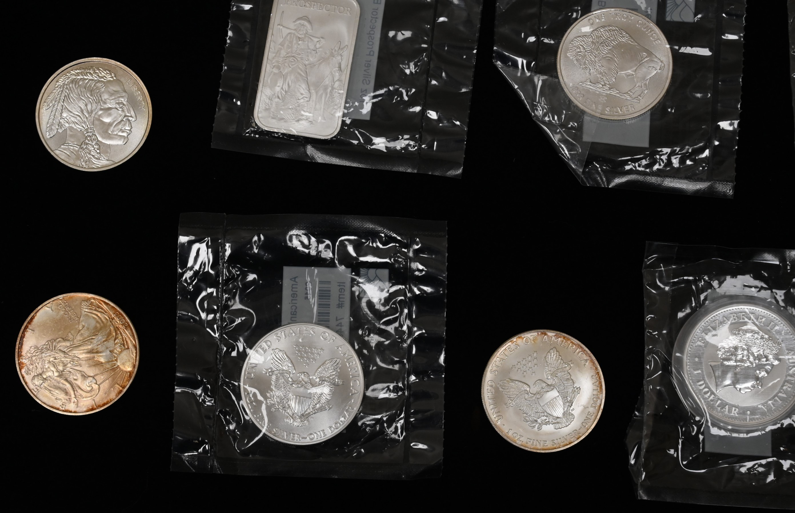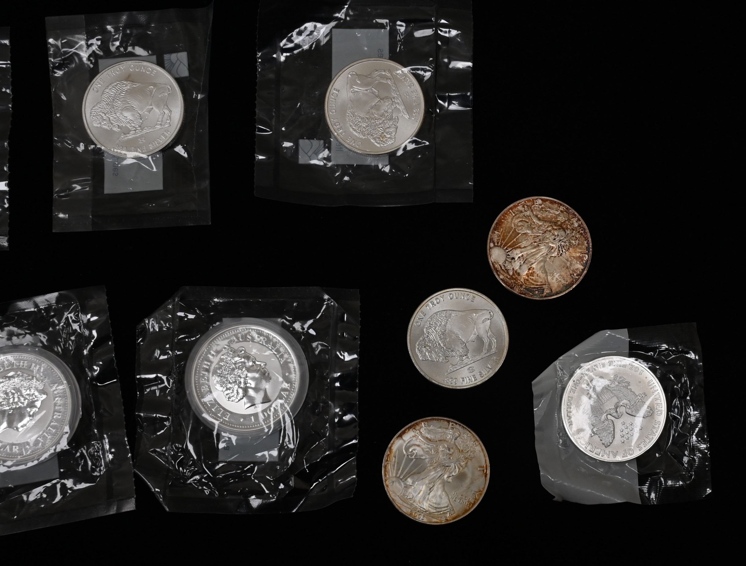 Miscellaneous Coin Lot, to include 5 2003 silver Eagles, 1, 2015 silver Eagle, 5 Buffalo silver rounds one ounce, 2 Australia one ounce rounds and one Prospector one ounce bar, total weight 14 t.oz.