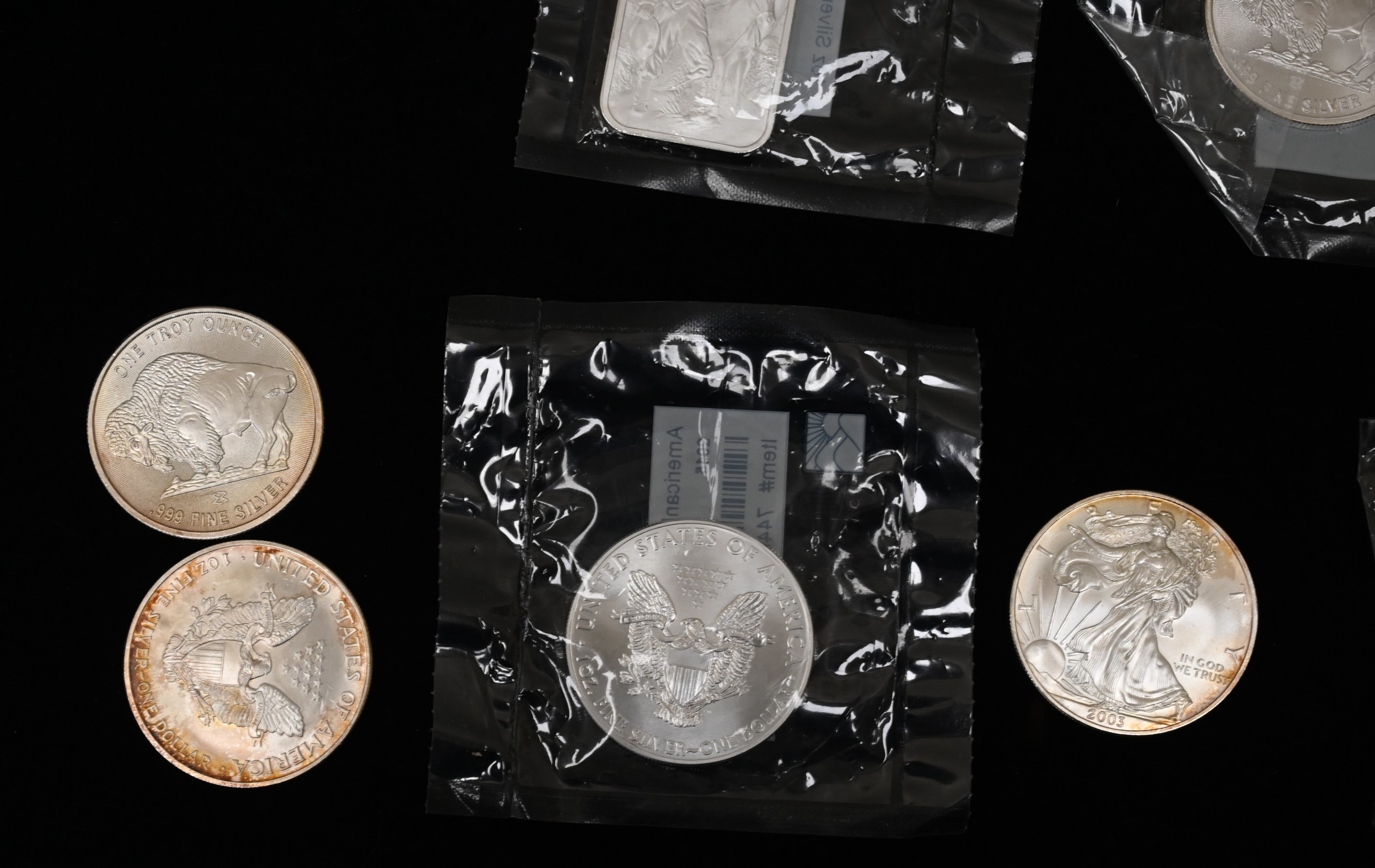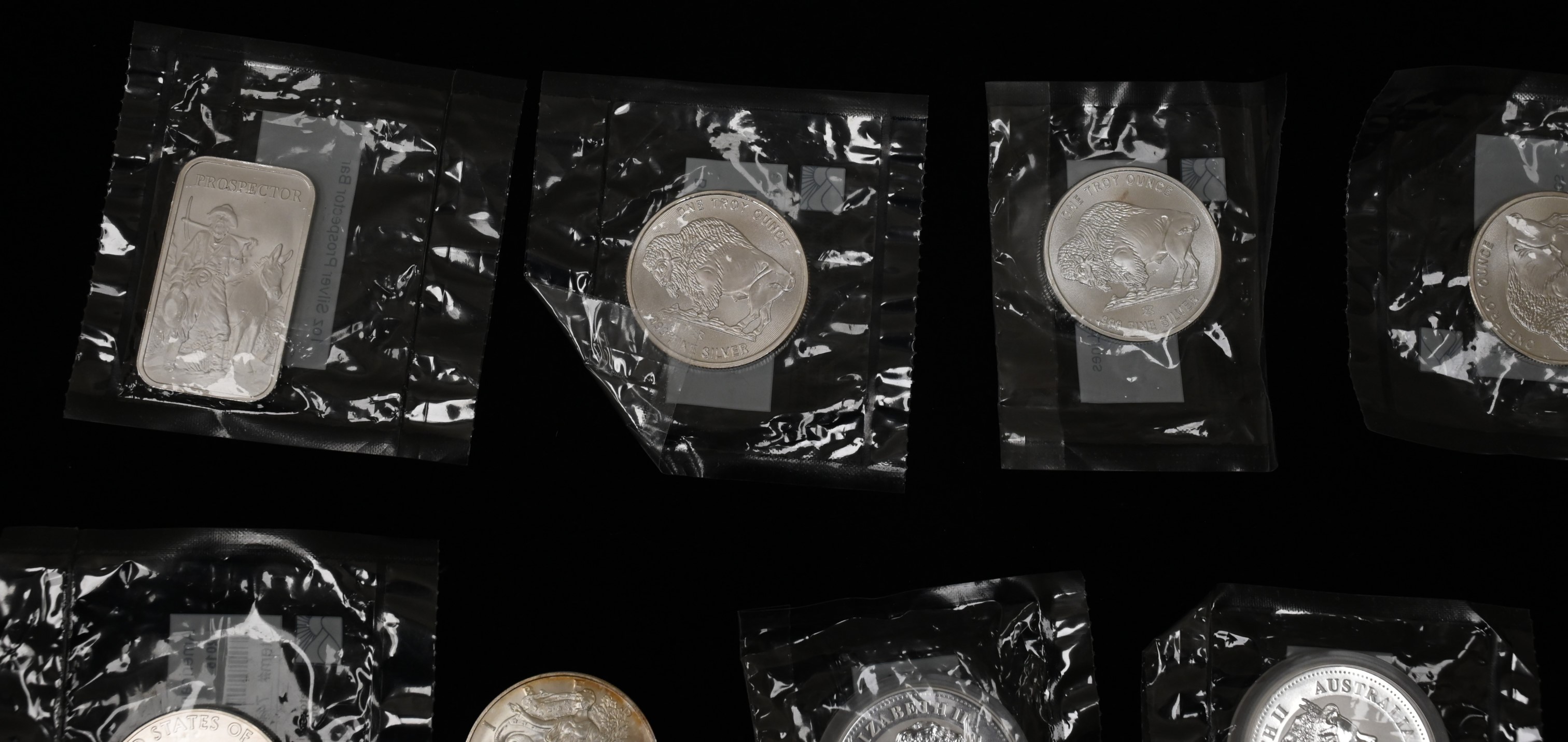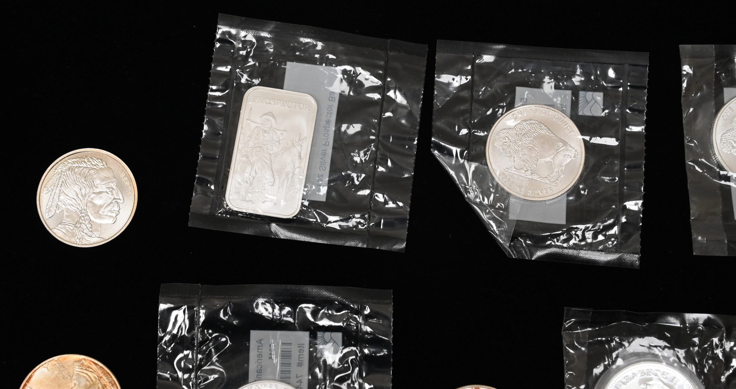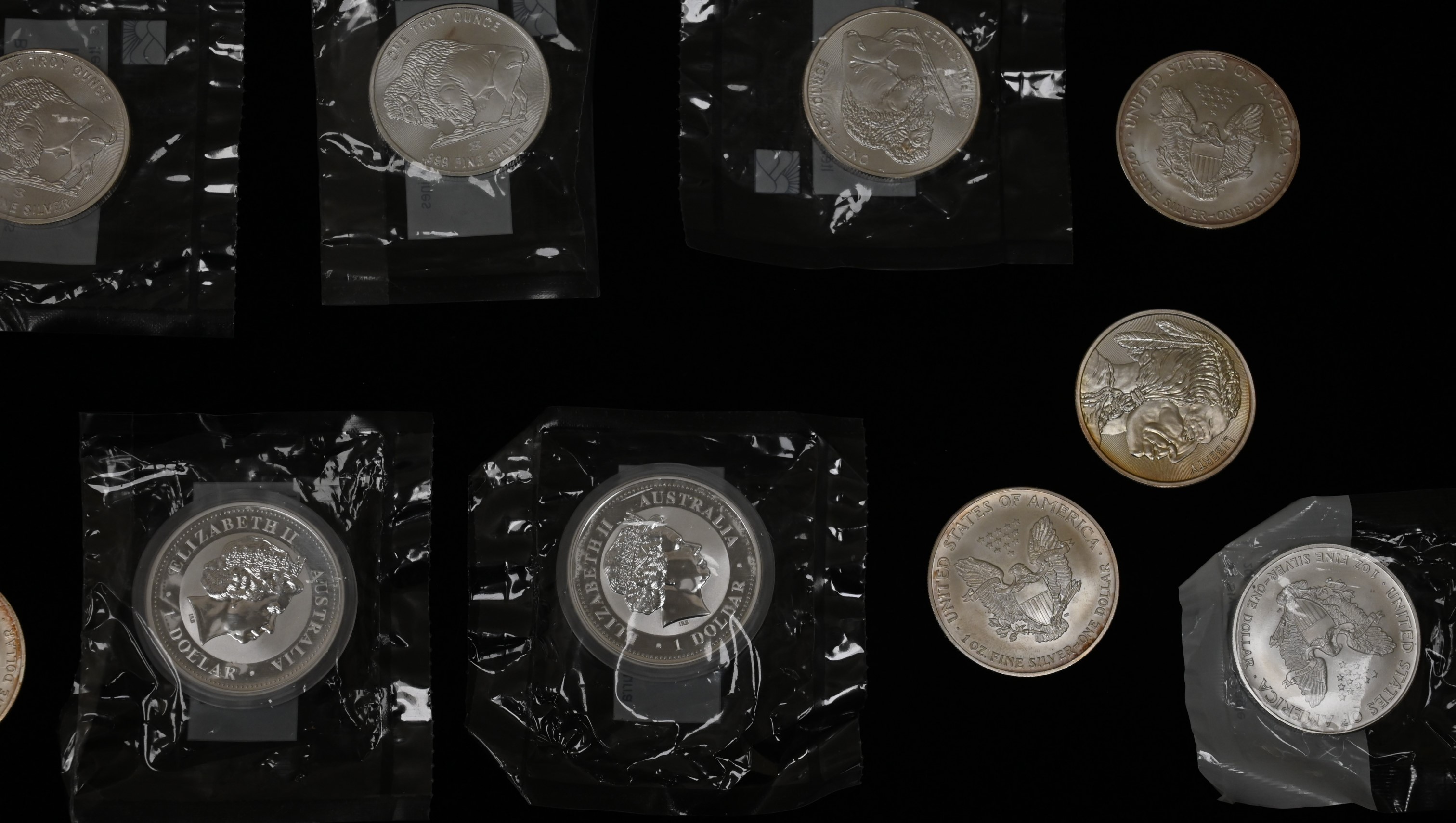 Miscellaneous Coin Lot, to include 5 2003 silver Eagles, 1, 2015 silver Eagle, 5 Buffalo silver rounds one ounce, 2 Australia one ounce rounds and one Prospector one ounce bar, total weight 14 t.oz.