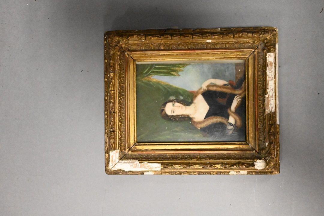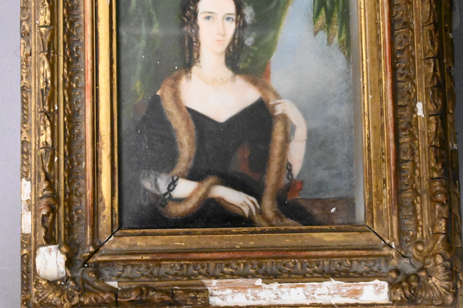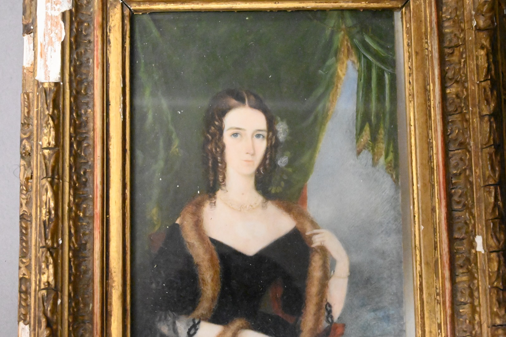 Painting on Ivory, woman, late 18th/early 19th century, 3 3/4″ x 5″. Please note: Items containing ivory cannot be purchased or shipped by bidders residing outside of the United States or California, Hawaii, Nevada, New Jersey, New York, Washington, Oregon, or District of Columbia. If an ivory item is purchased by a bidder in one of the above mentioned locations or attempts to ship ivory to one of the above mentioned locations, bidder will forfeit the item and be responsible for any incurred fees such as a restocking fee.