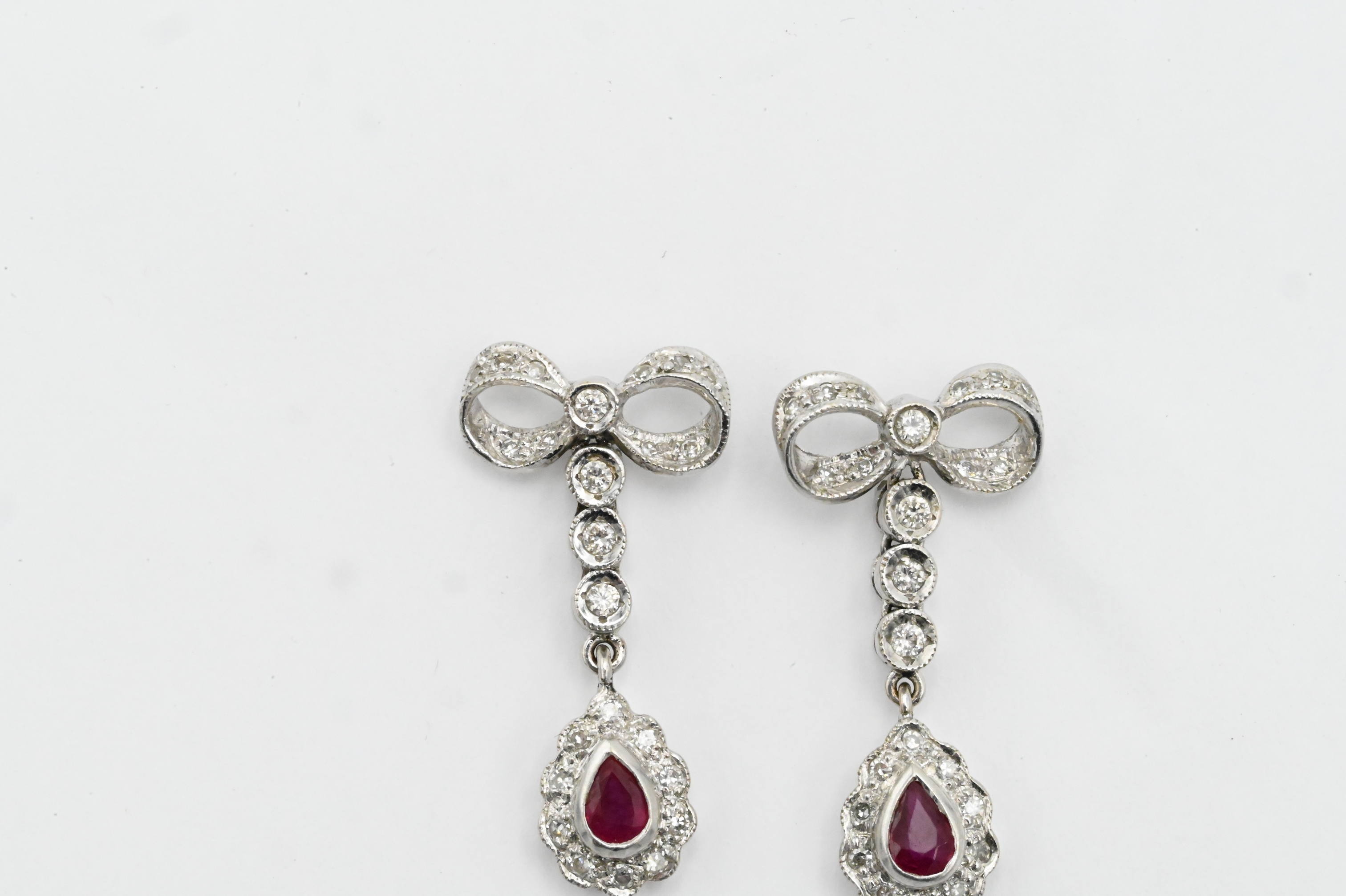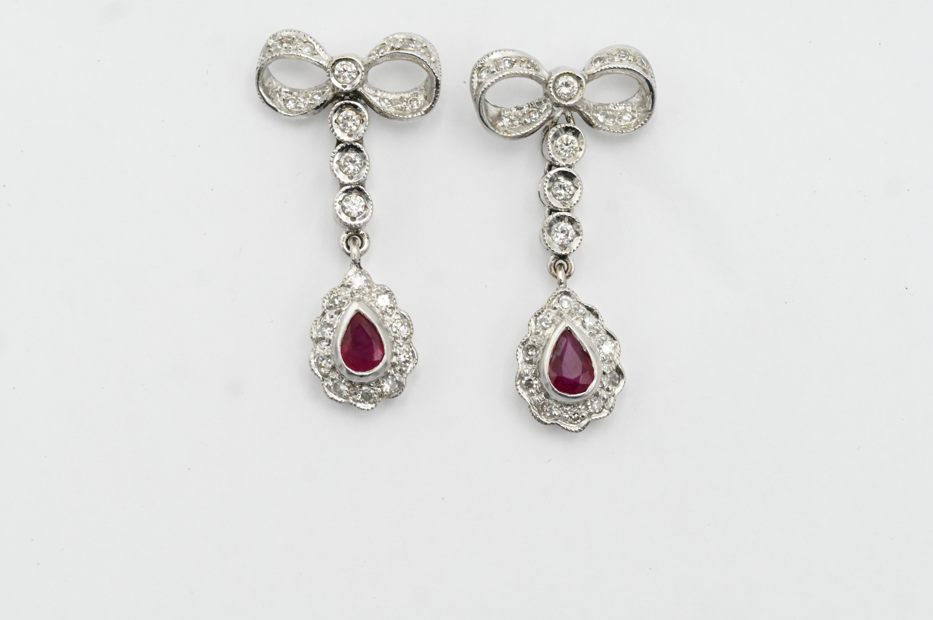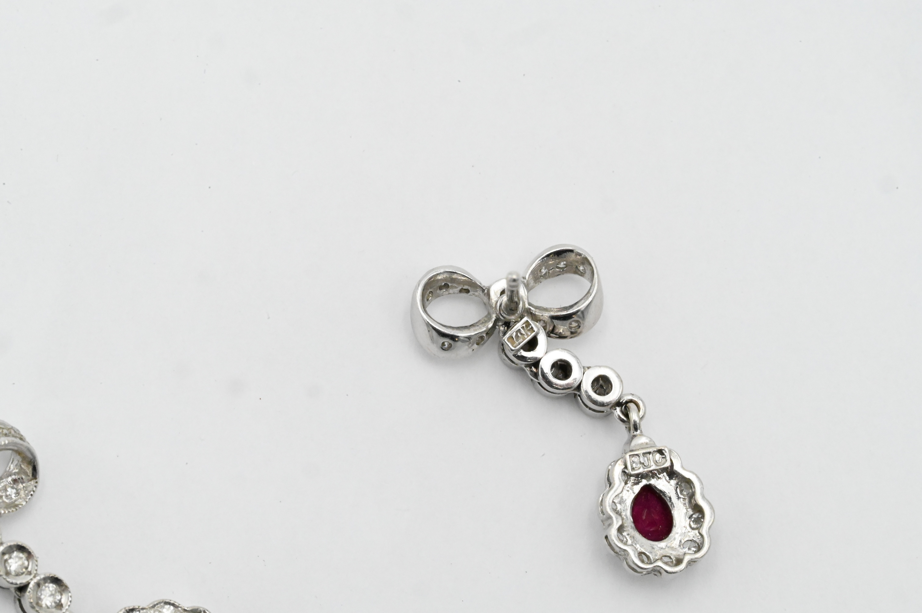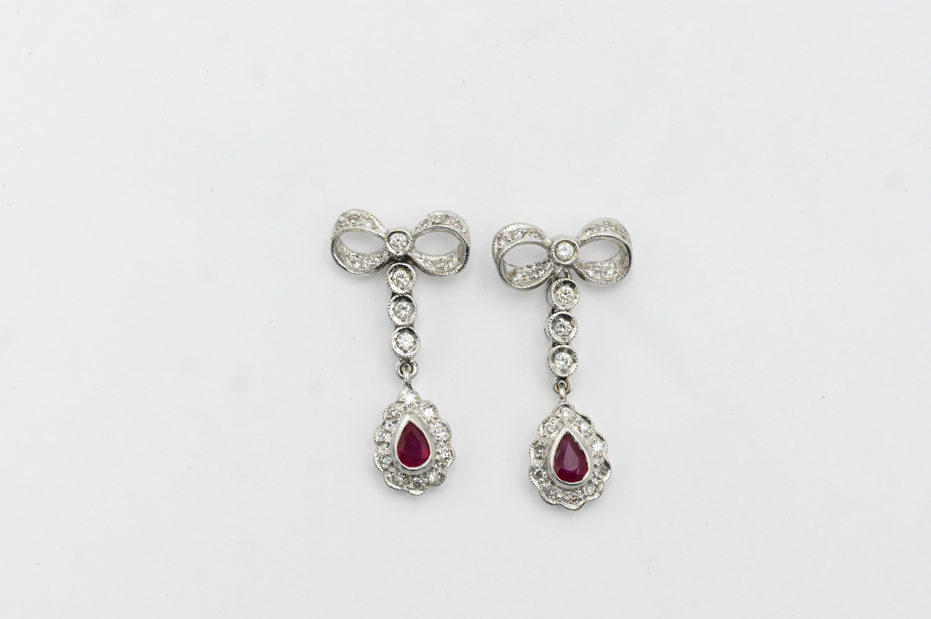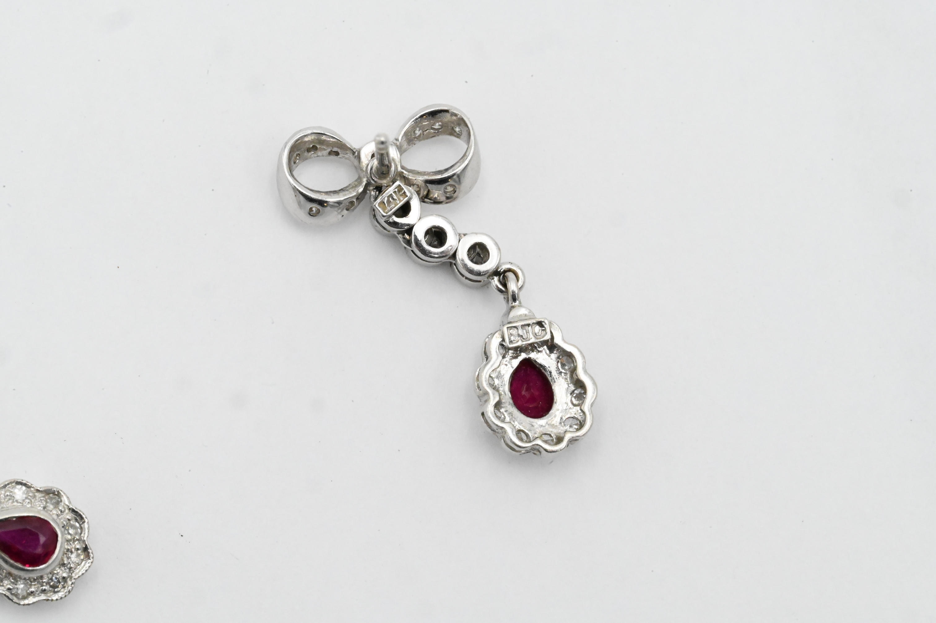 having diamond bow and diamond drop as well as pear shaped ruby surrounded by diamonds