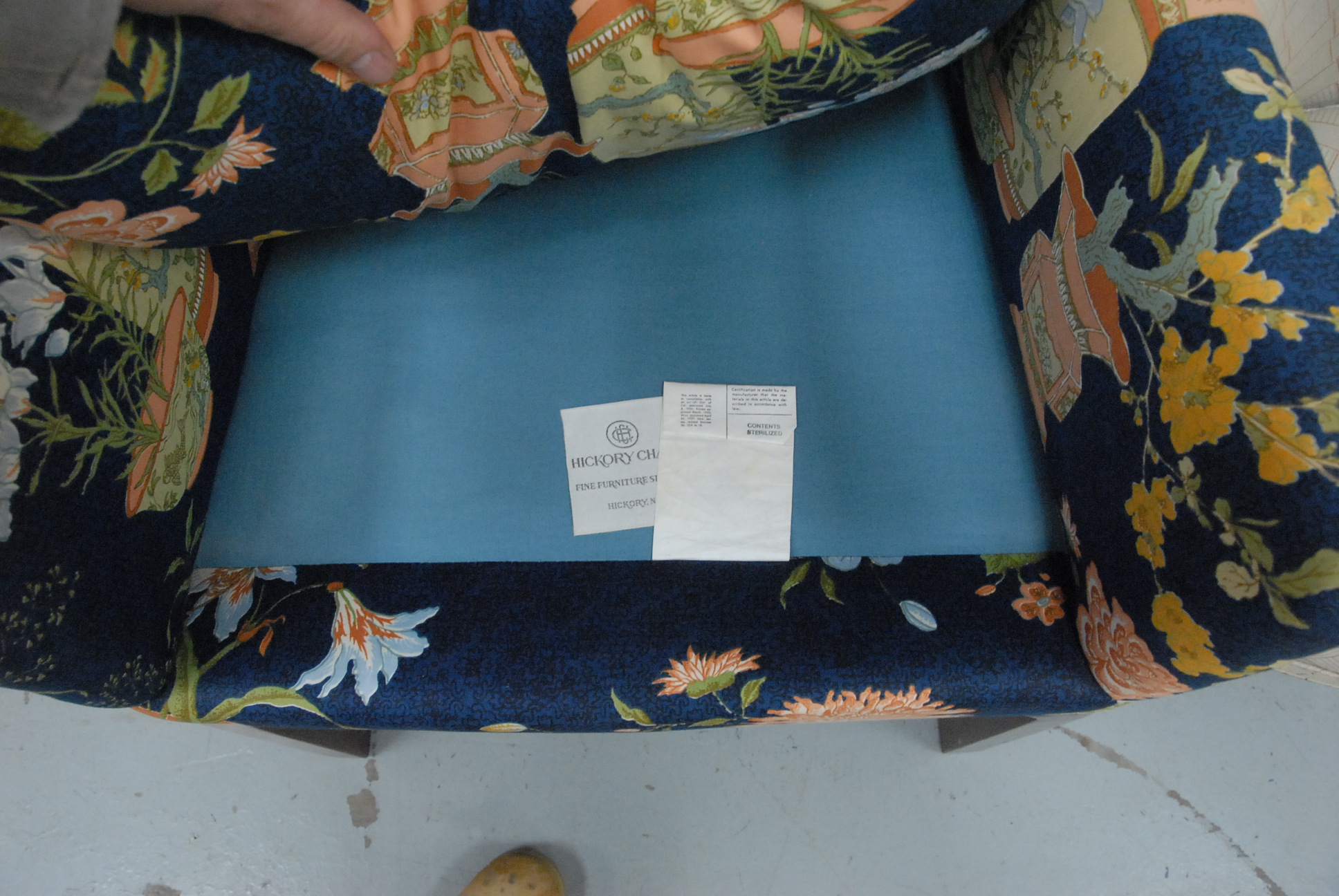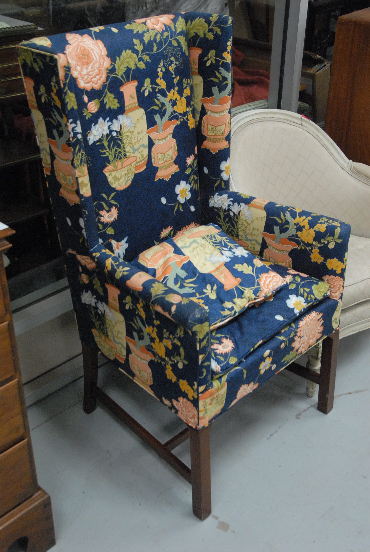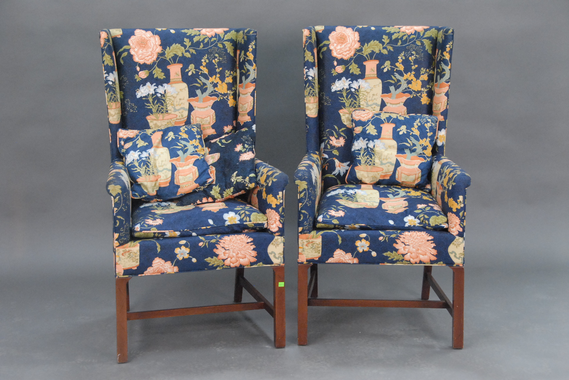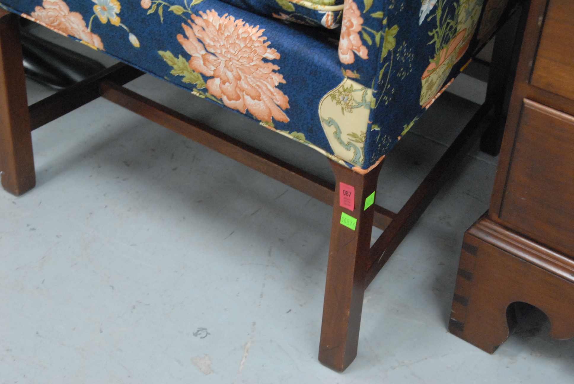 Pair of custom mahogany Chippendale style upholstered wing chairs, Hickory chair company