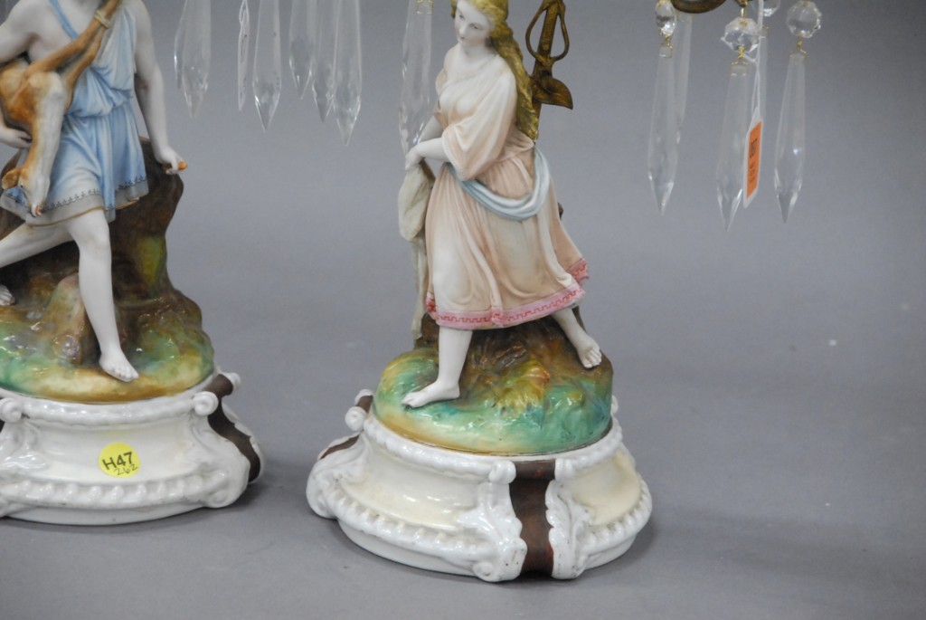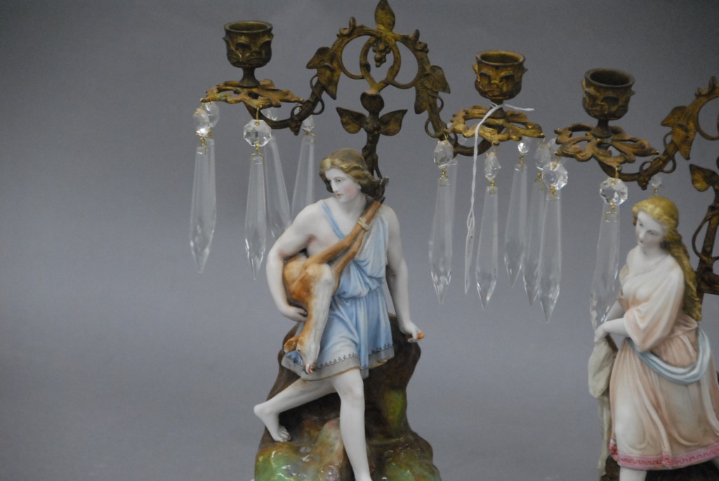 Pair of porcelain and bisque two light candelabra mounted with figures.