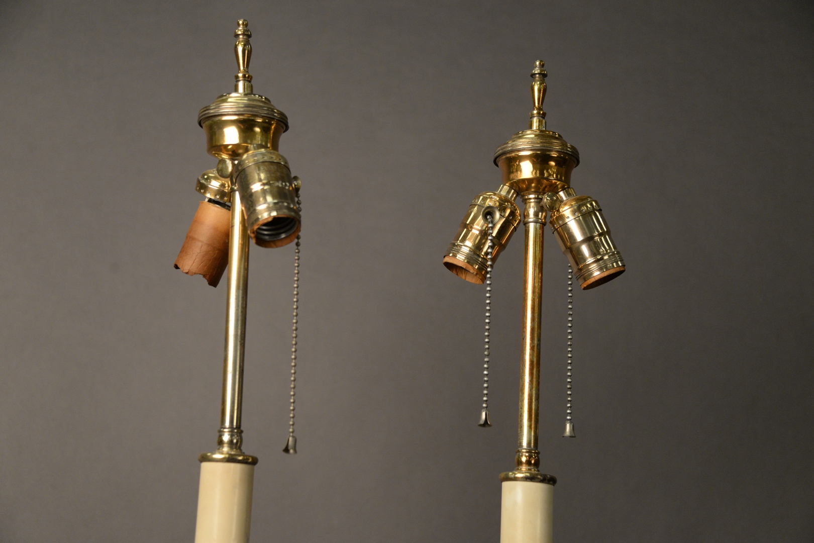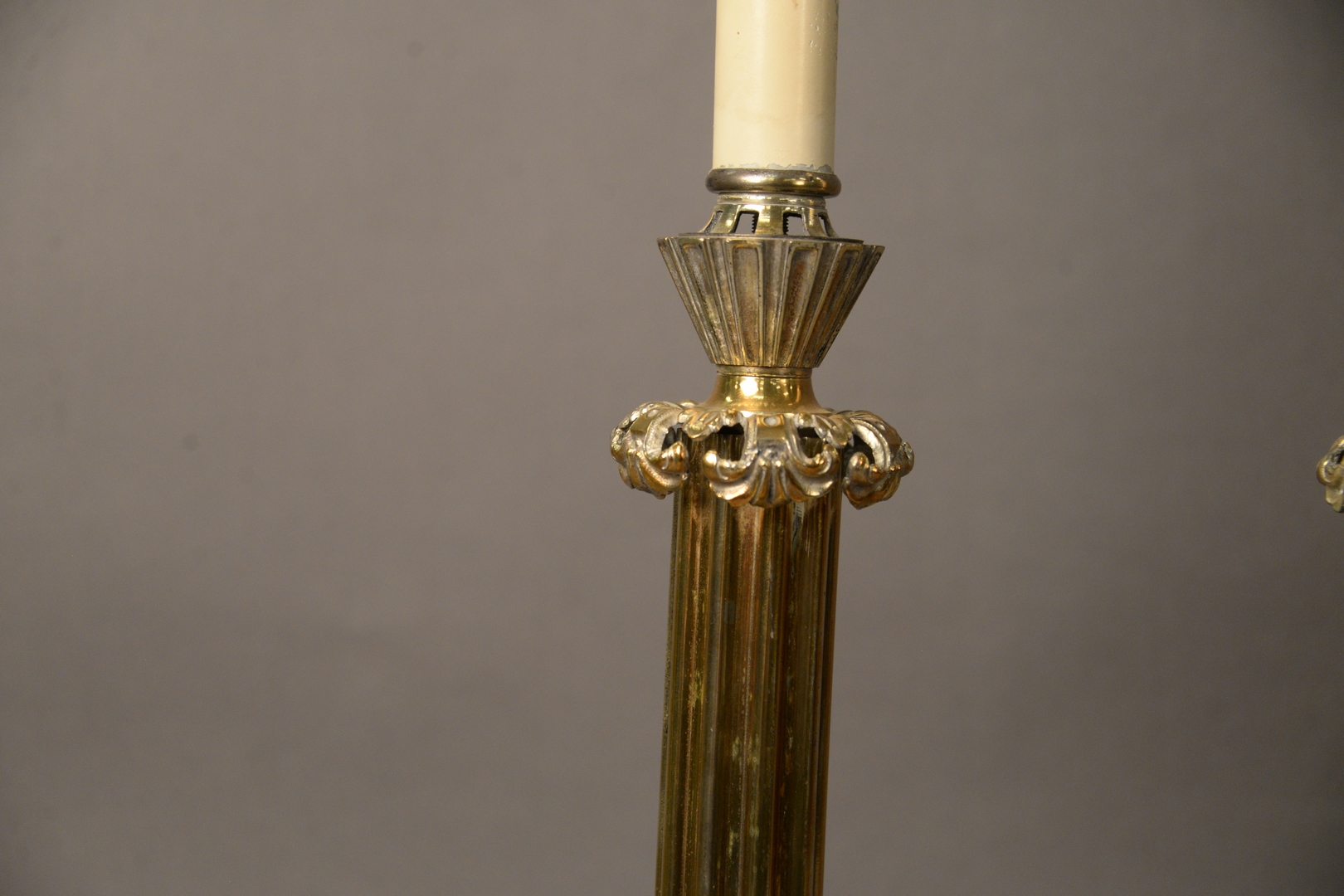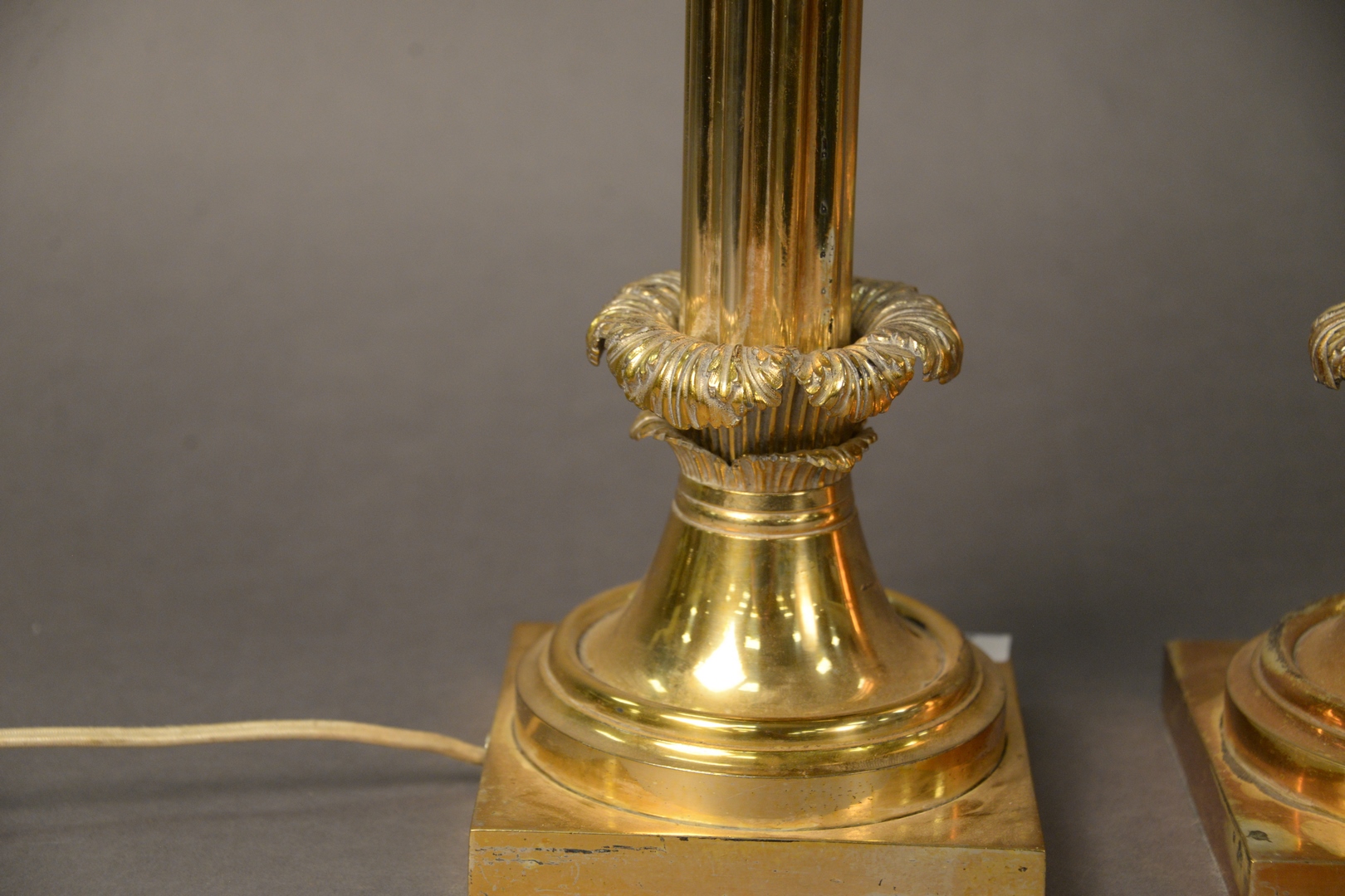 Lot 87: Pair of Silver Plated Table Lamps, having two lights each and mounted on square bases, overall height 34 1/2 inches, heavily tarnished.