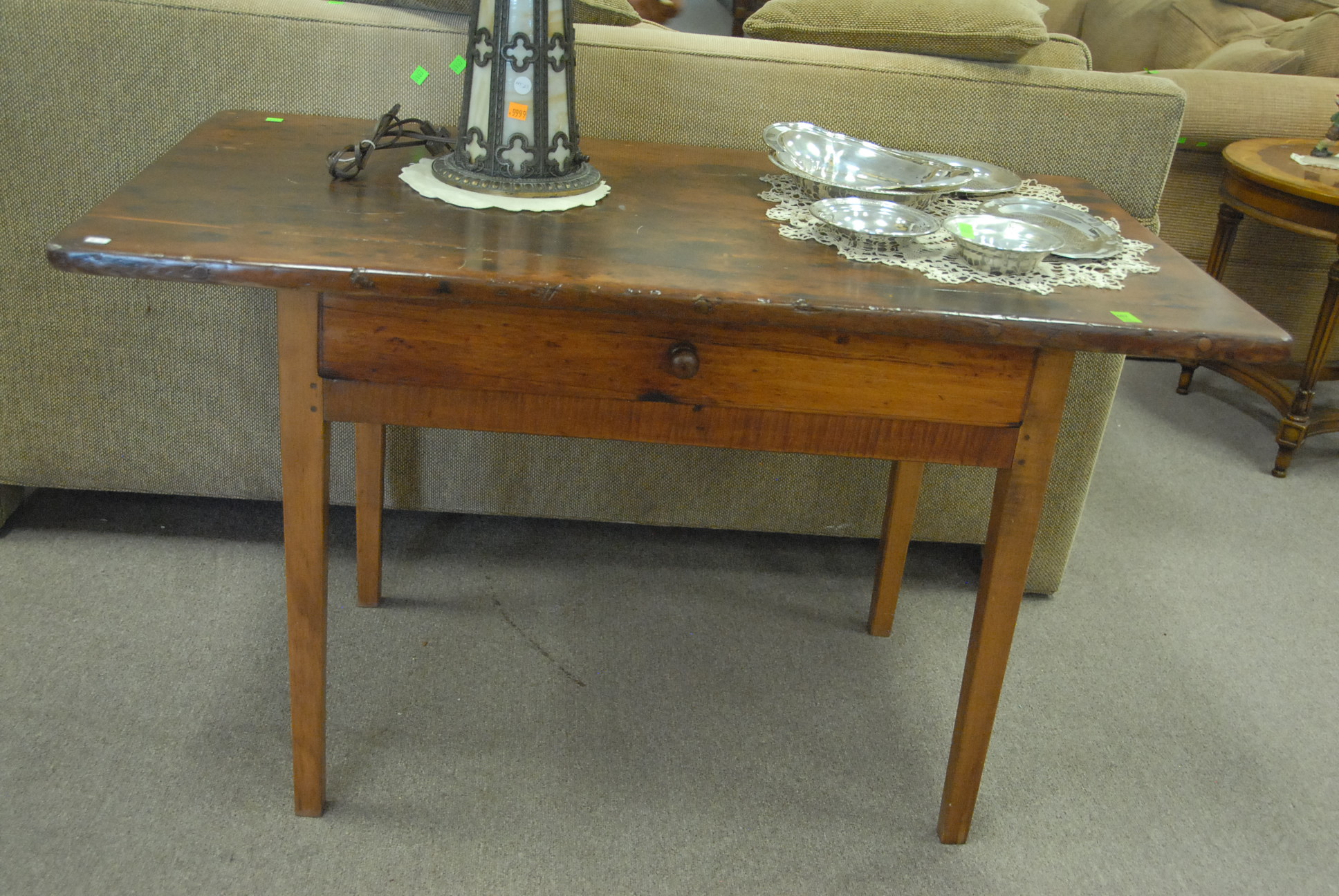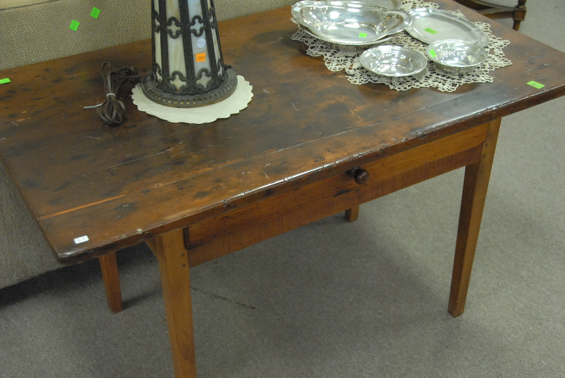 Lot 87: Primitive pine and maple one drawer table having pine top and maple frame, ht. 27in. lg. 46in.
