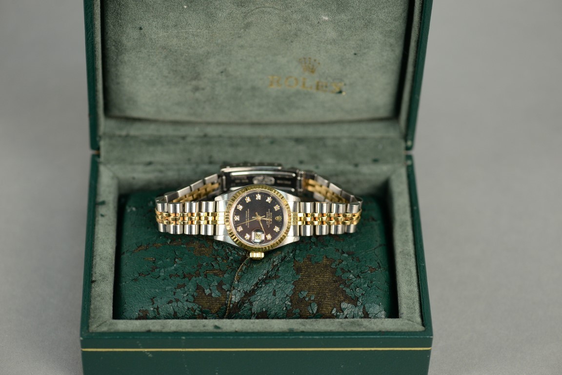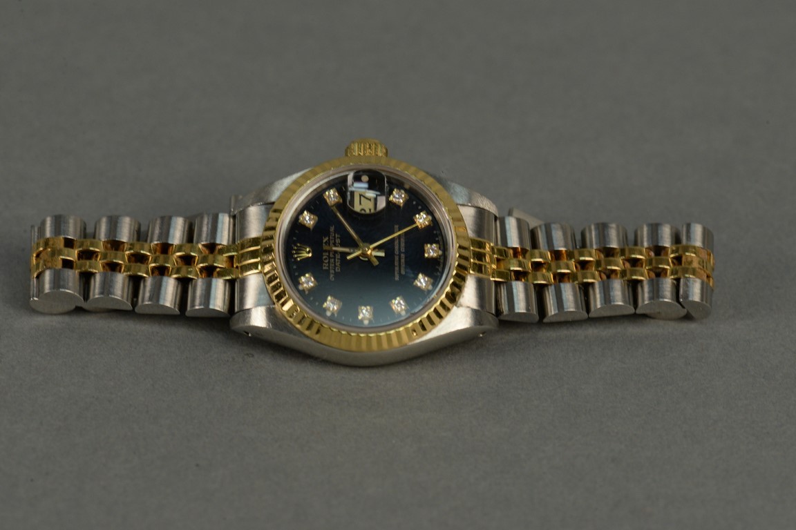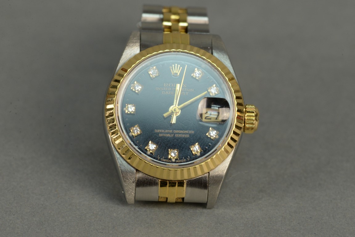 Rolex stainless and gold ladies wristwatch having black dial, set with eleven diamonds.