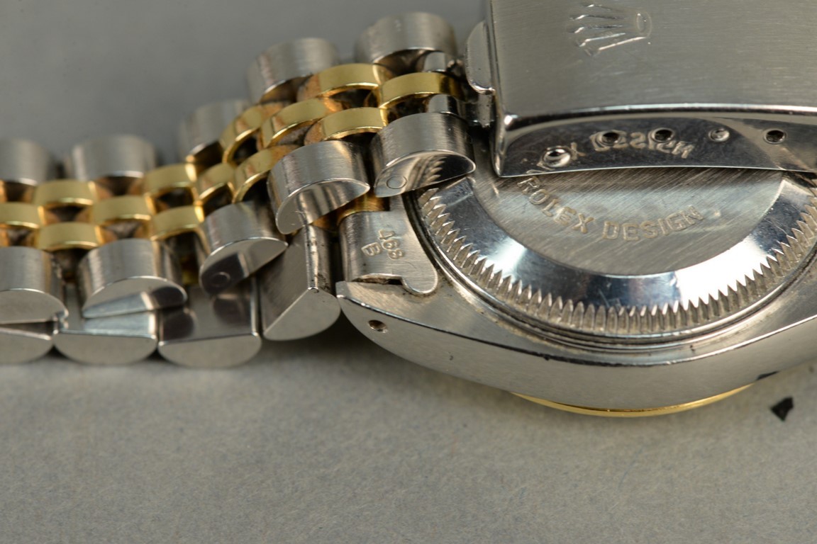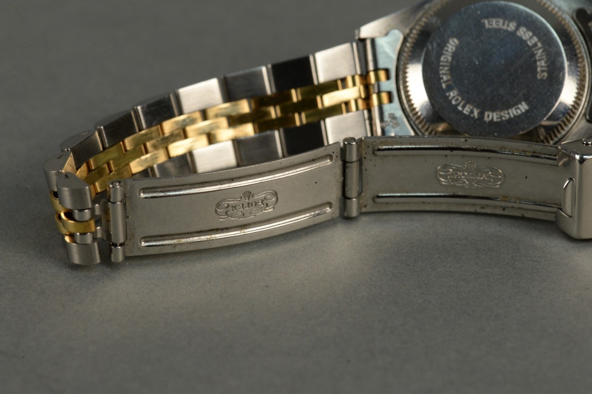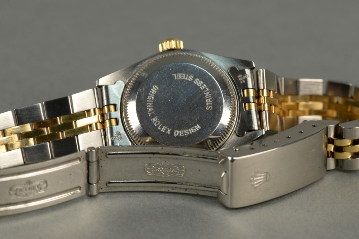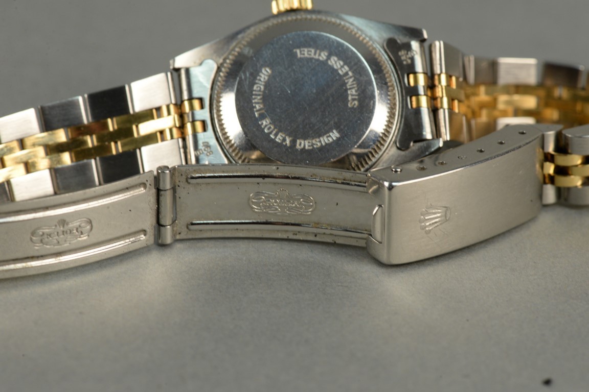 Rolex stainless and gold ladies wristwatch having black dial, set with eleven diamonds.