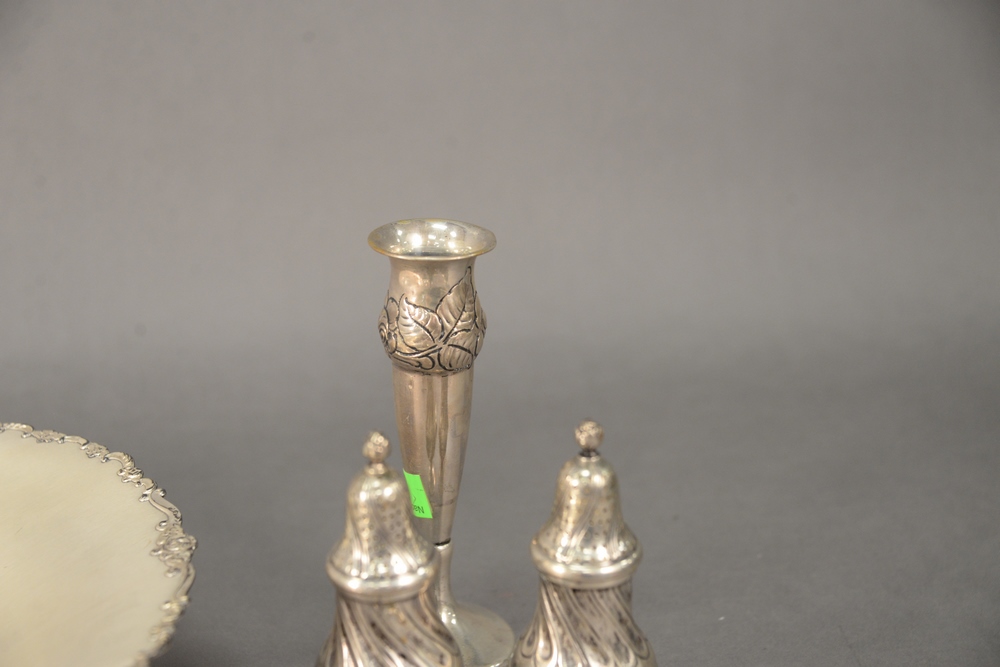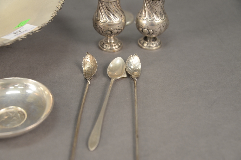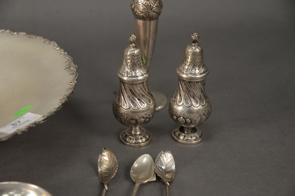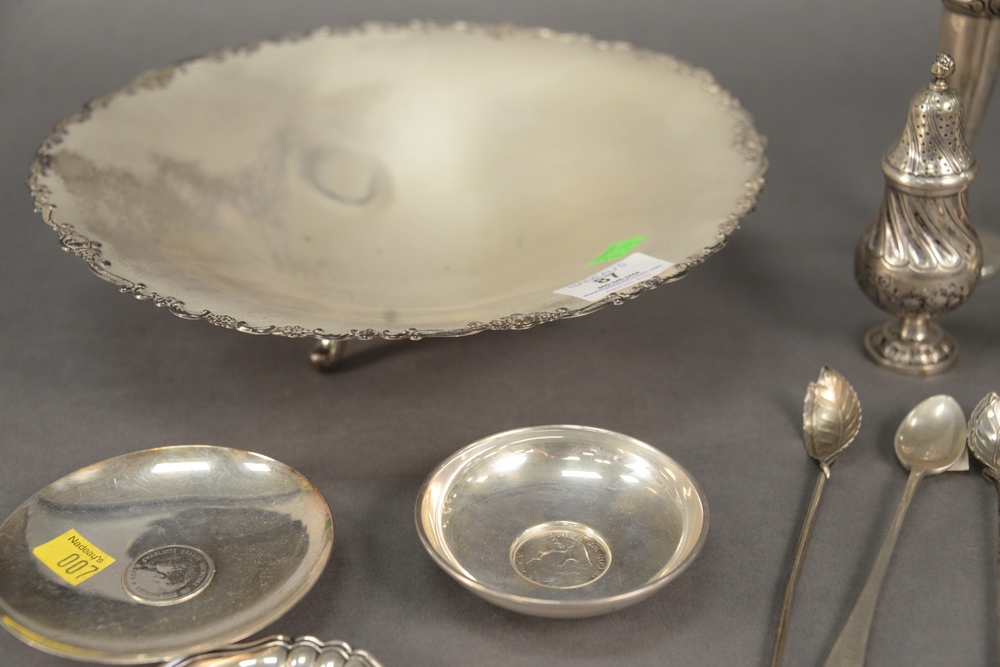 Lot 87: Silver Lot, to include large shallow bowl, pepper shakers, etc., 27 t.oz. weighable.
