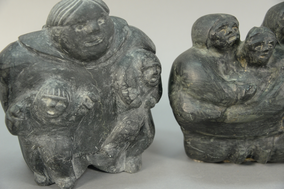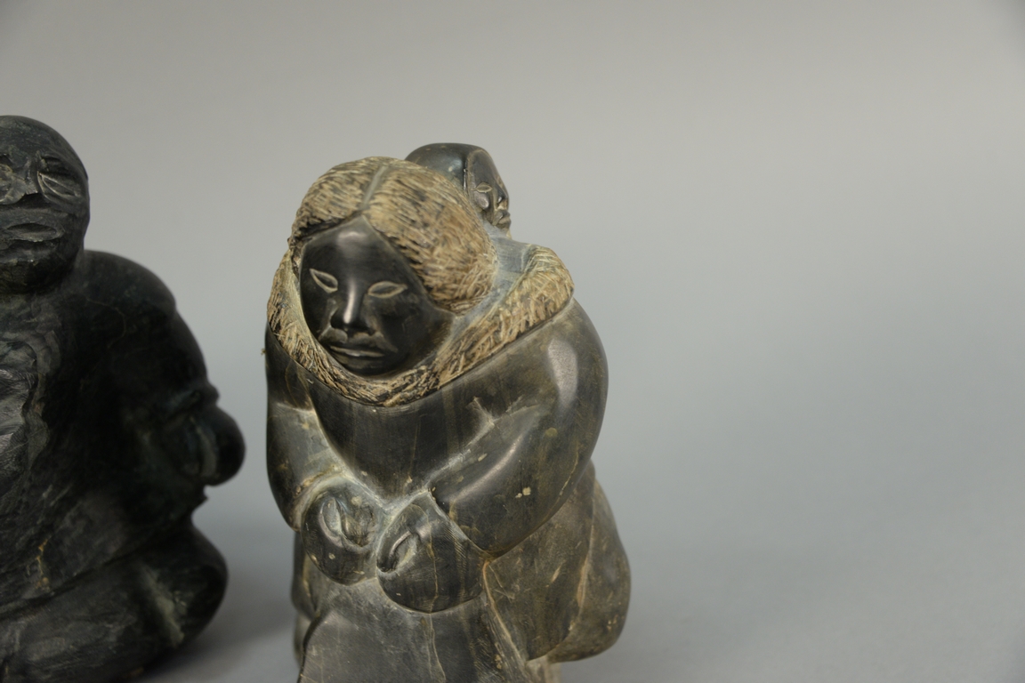 Three large Inuit Eskimo carvings unsigned, two with multiple figures and one of a woman carrying child on her back, all three with 30in. pedestal. ht. 8 1/2in., 9in., & 9in.