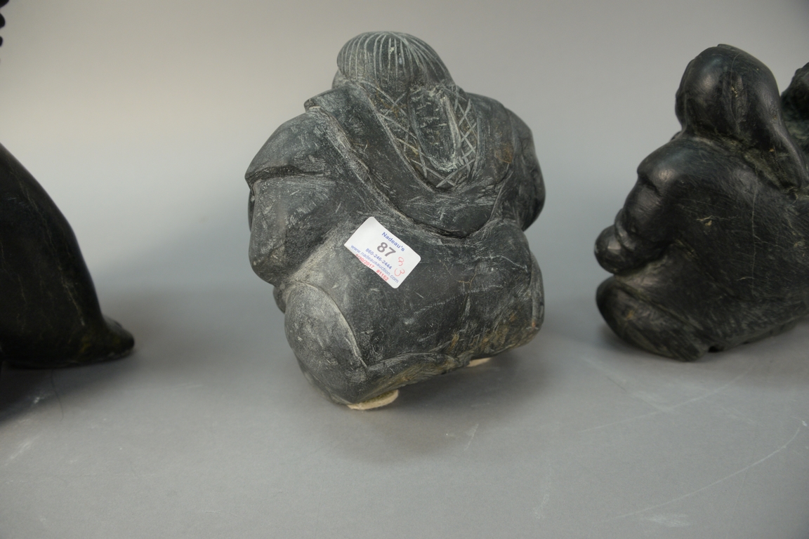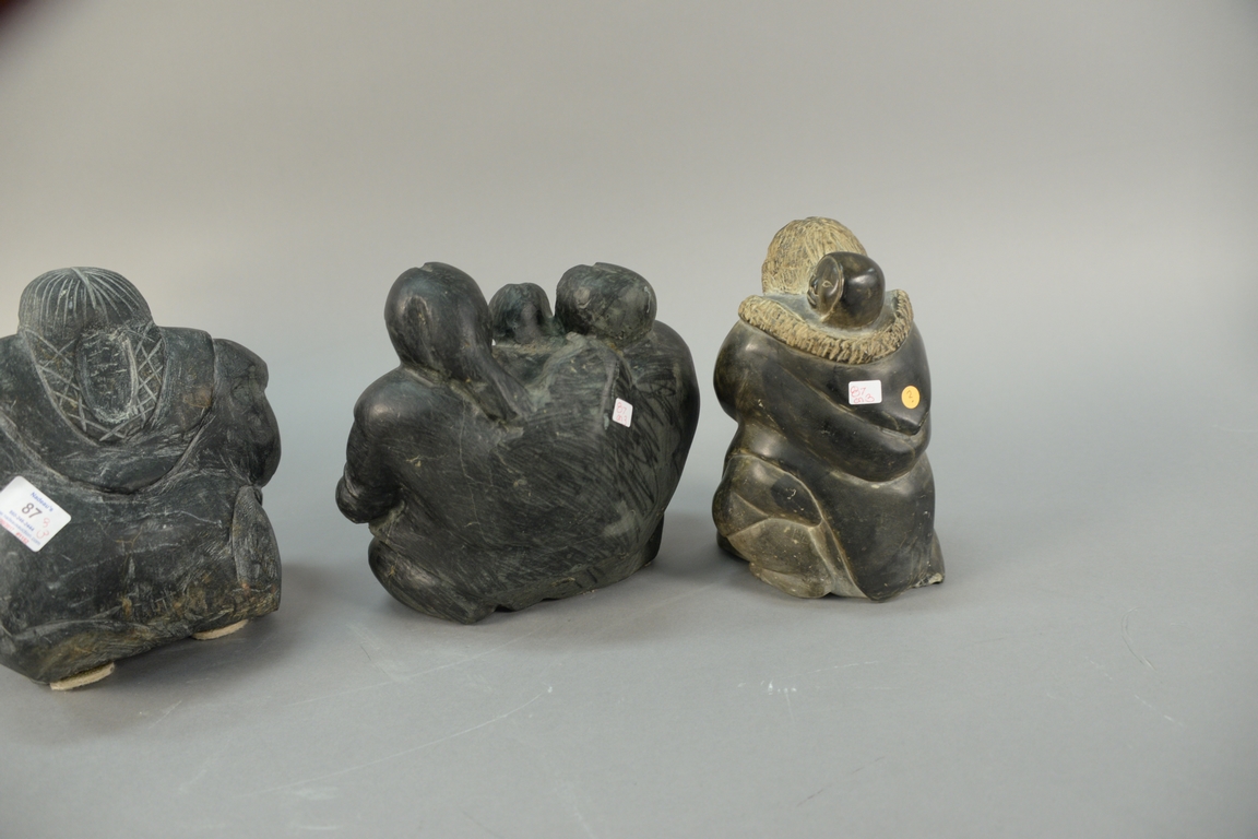 Lot 87: Three large Inuit Eskimo carvings unsigned, two with multiple figures and one of a woman carrying child on her back, all three with …