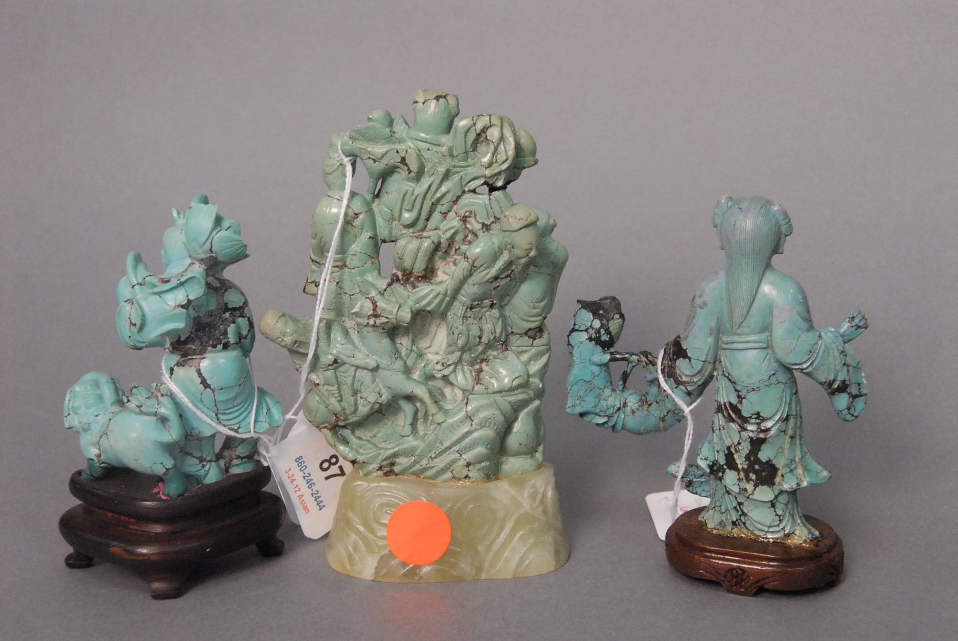 Turquoise group of three carved figure groups to include a large figural group of eight scholars holding different items on a hardstone stand, ht. 6, wd. 3 1/2, carved guanyin standing holding a flower and a lotus on a stand ht. 4 1/2, and a man standing next to a foo dog holding a lotus and a flower as is, ht. 4 1/2.