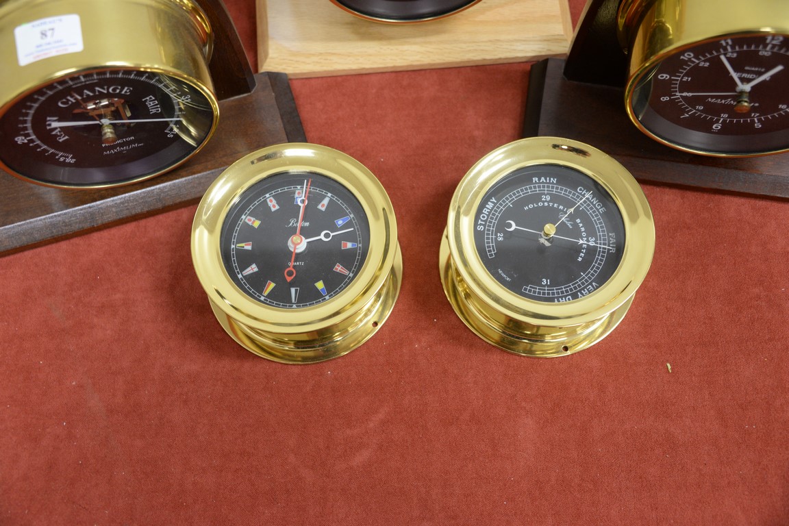 Twelve piece lot to include Chelsea Holosteric barometer and clock set, barometer marked Newport and the clock marked Boston Quartz six ships style barometer and clocks porthole and two Tiffany clocks.