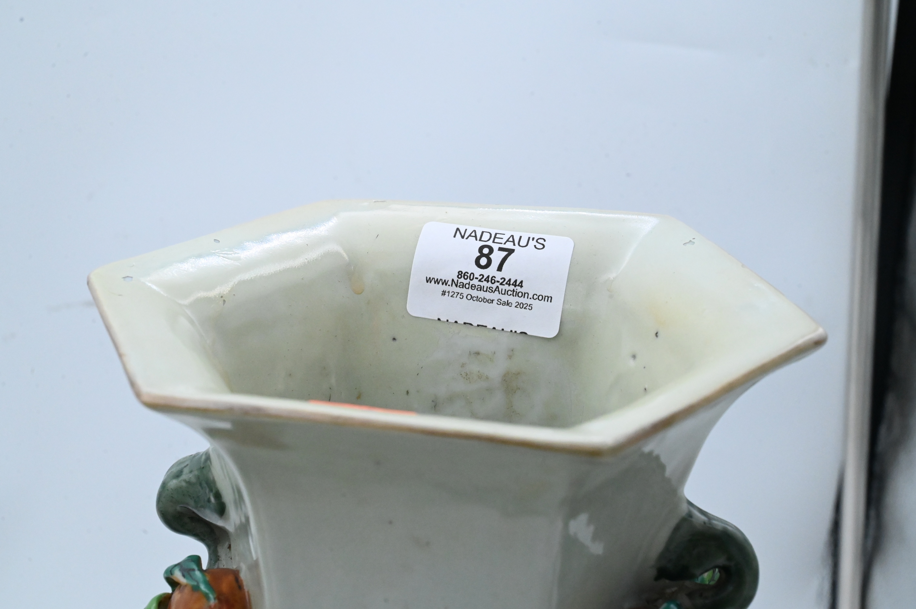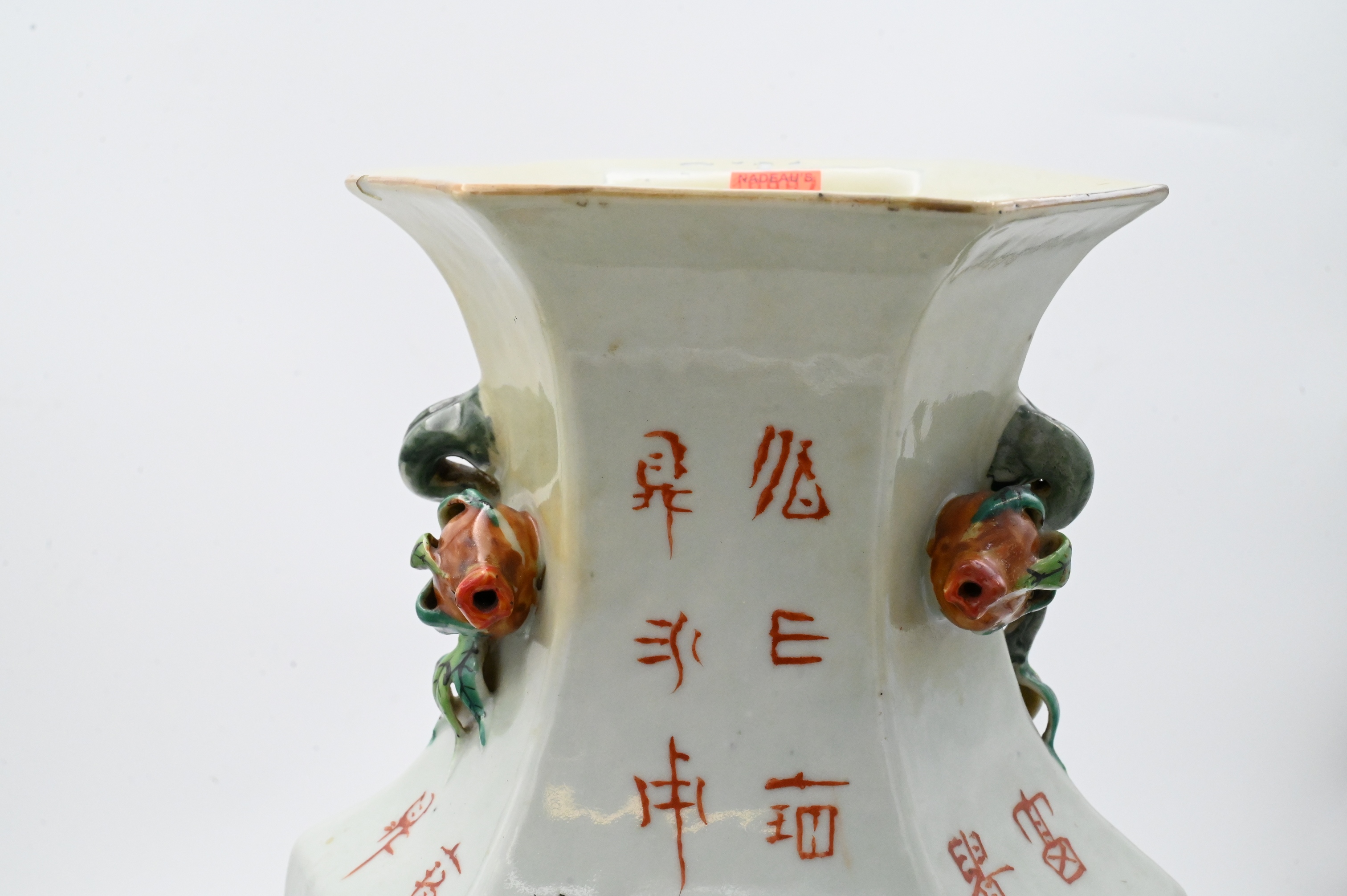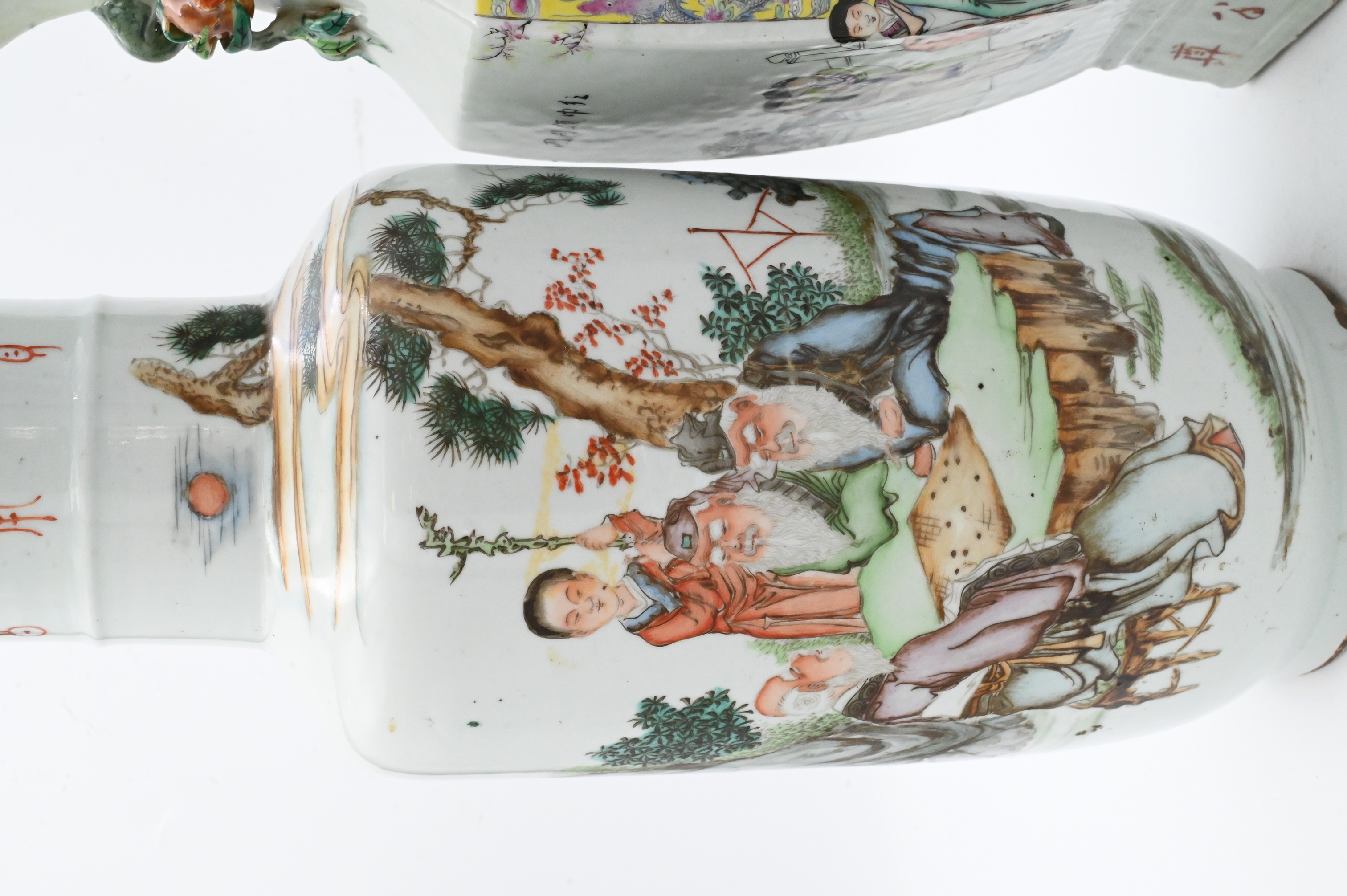 to include, one hexagonal vase having raised rose form handles with flower and Geisha motif , one vase having garden scene with scholars