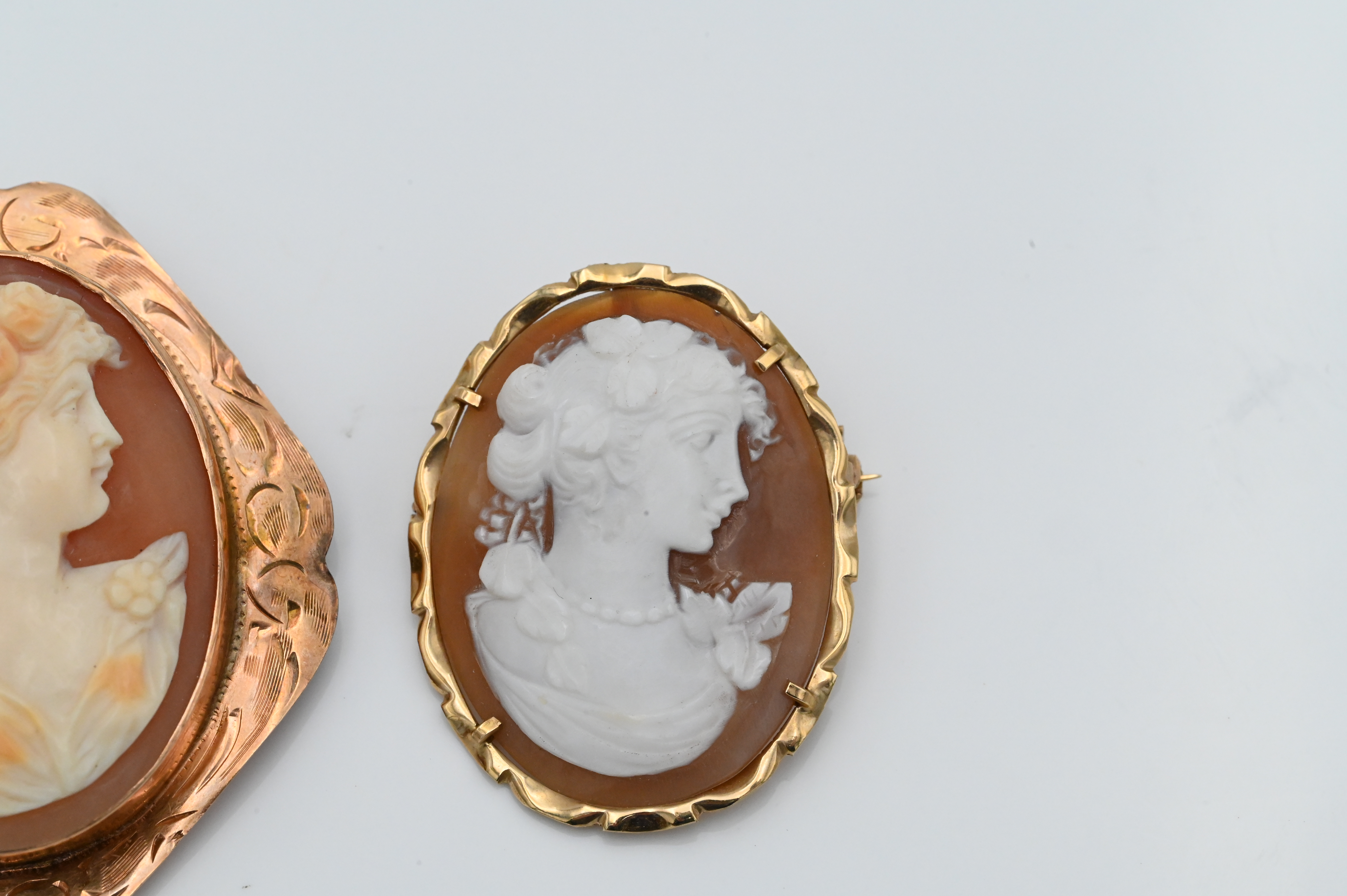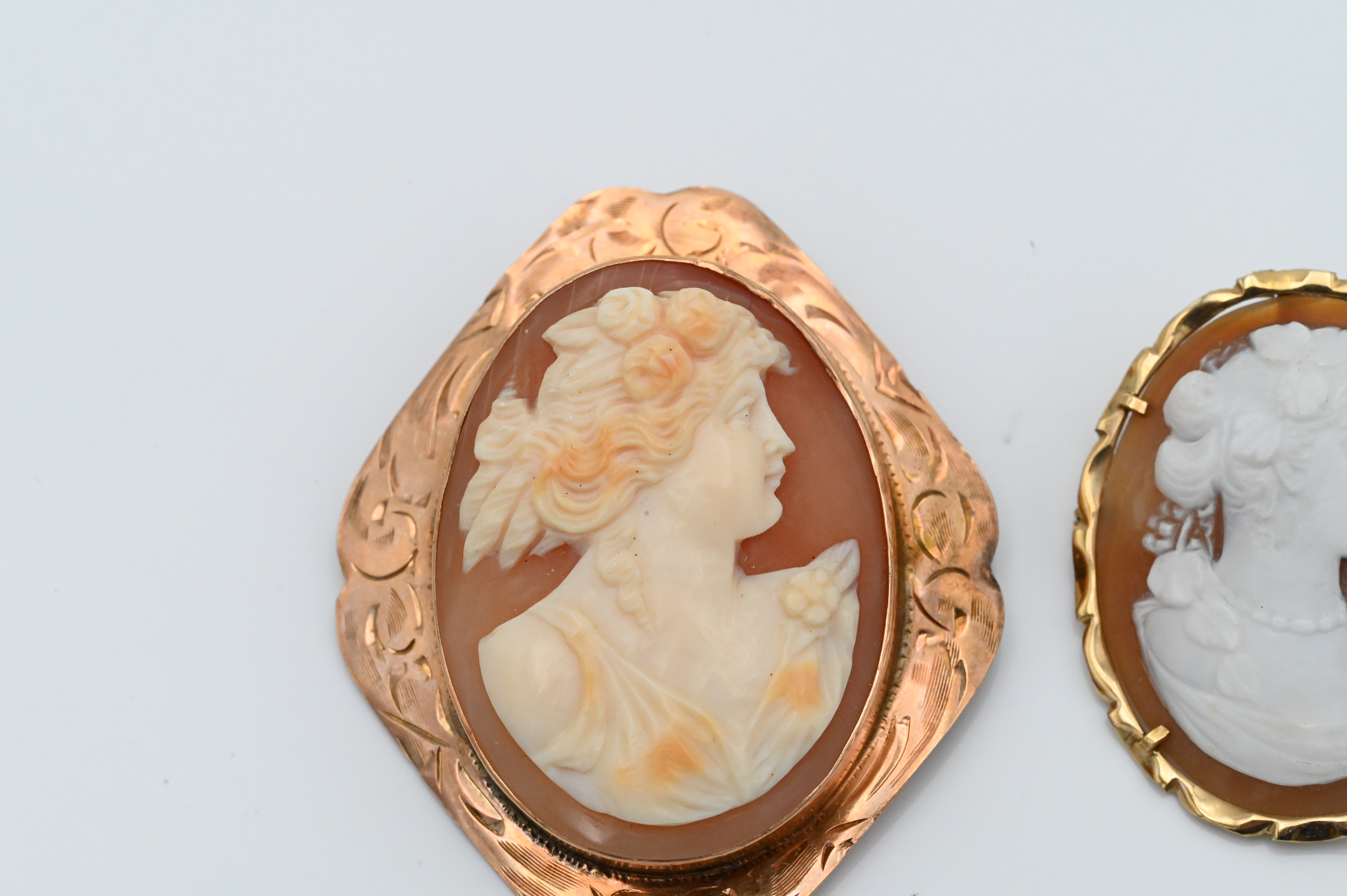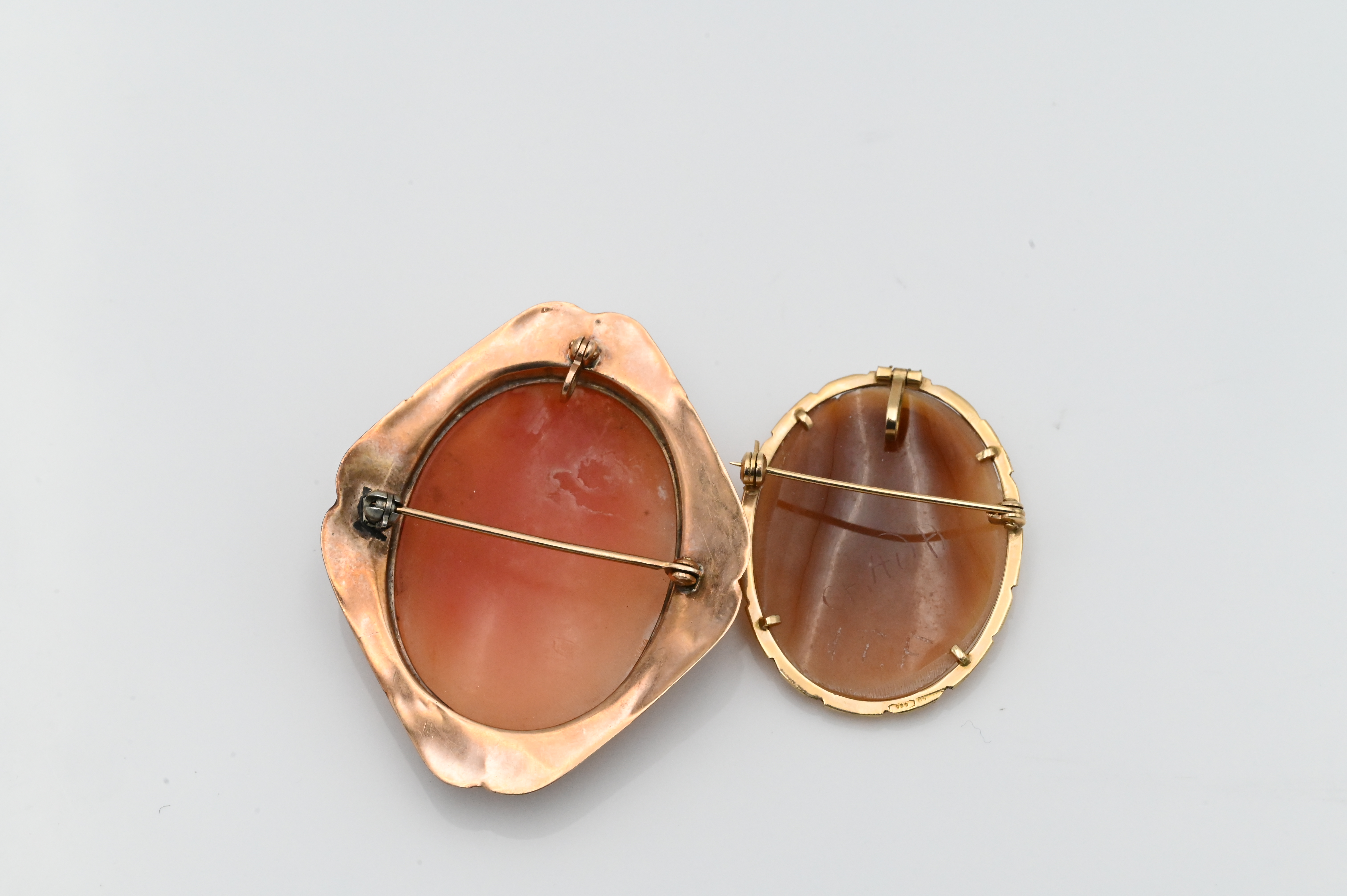 Two Gold and Shell Cameos, 1 3/4″ x 1 1/2″, 1 3/8″ x 1″.