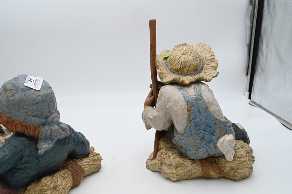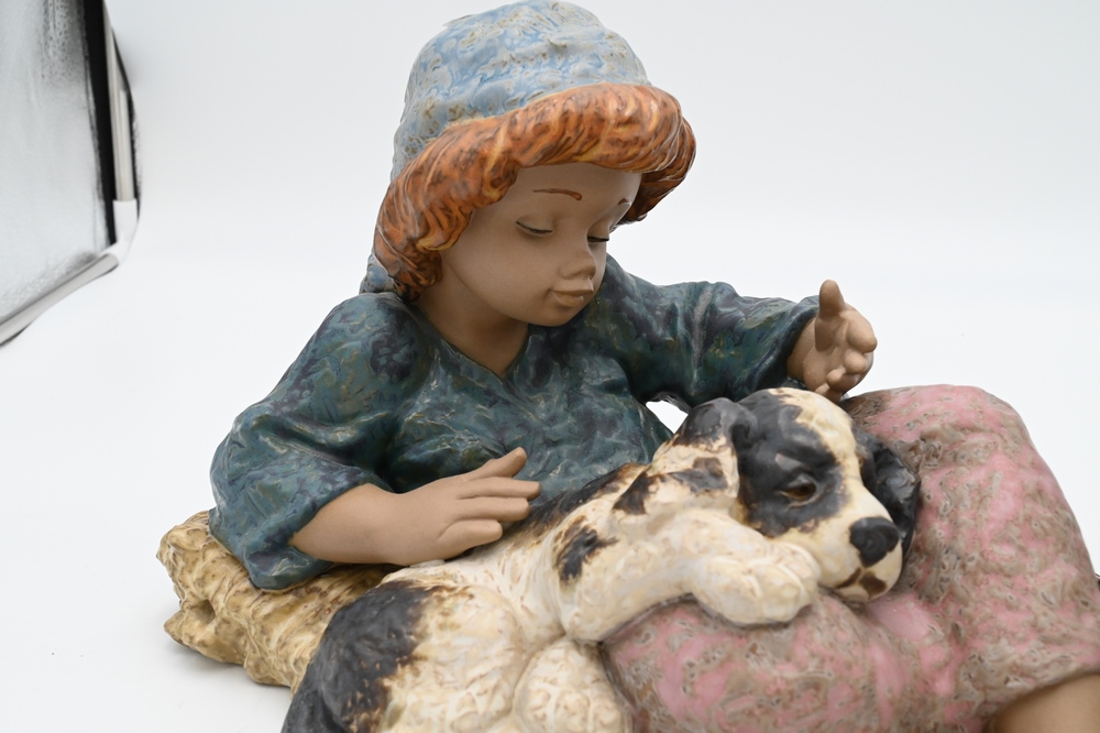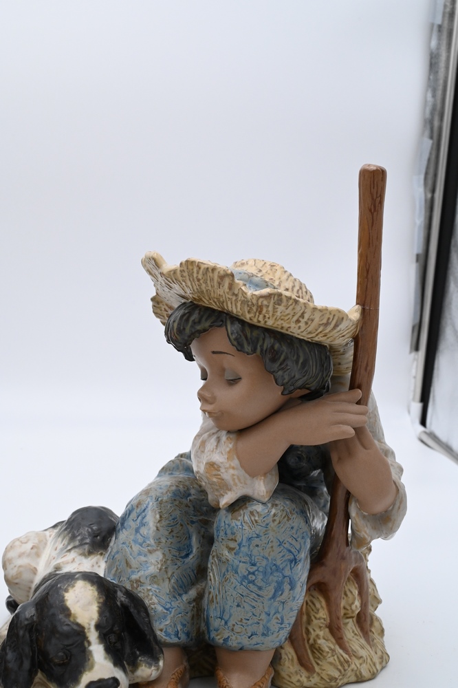 Lot 87: Two Large Lladro Porcelain Figurines, both boy with a dog, one with repair, heights 8 1/2 and 12 1/2 inches.