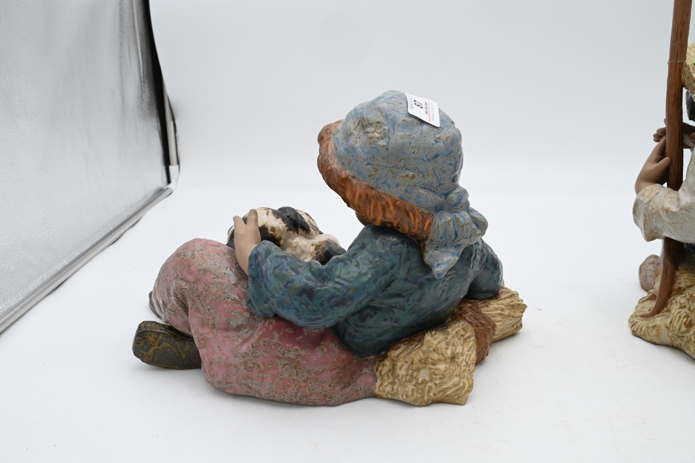 Two Large Lladro Porcelain Figurines, both boy with a dog, one with repair, heights 8 1/2 and 12 1/2 inches.