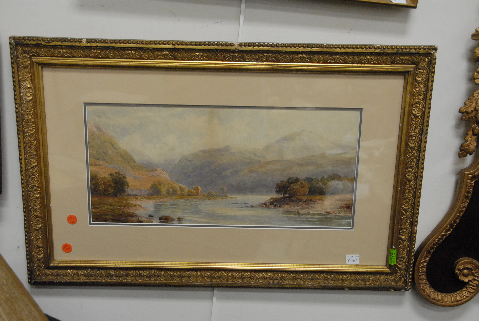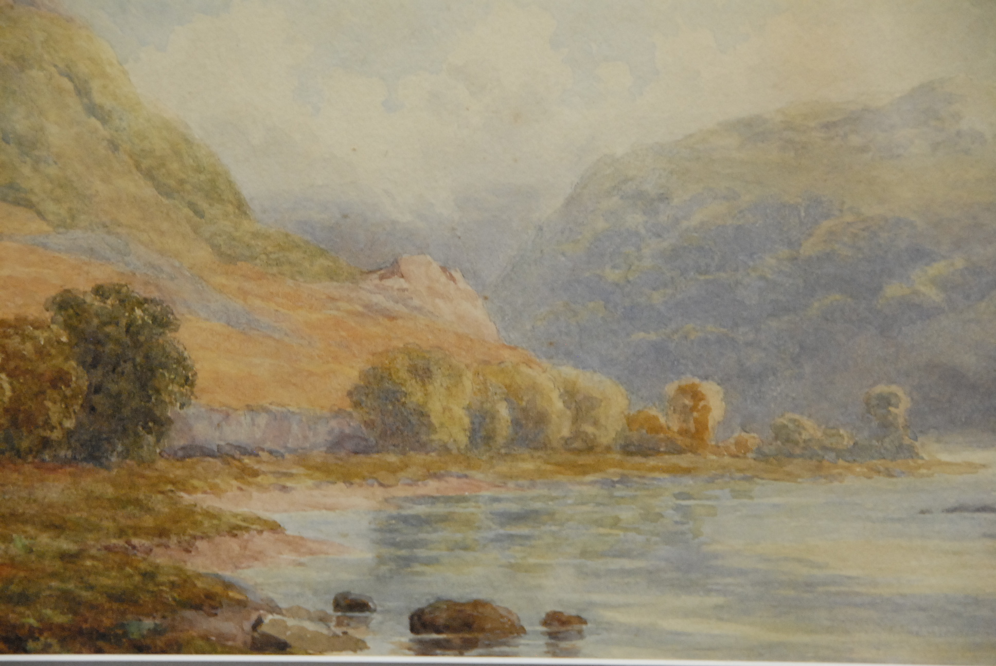 Watercolor of mountain and river scene.