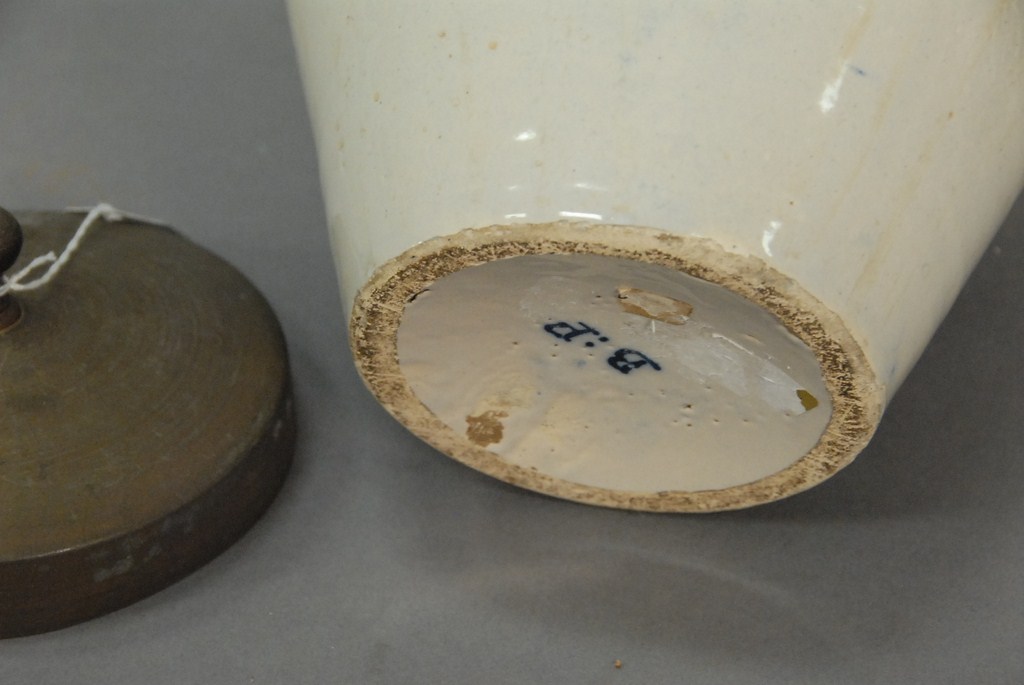 Pair of large Delft, blue and white jars with brass covers. ht. 11in. & 13in.