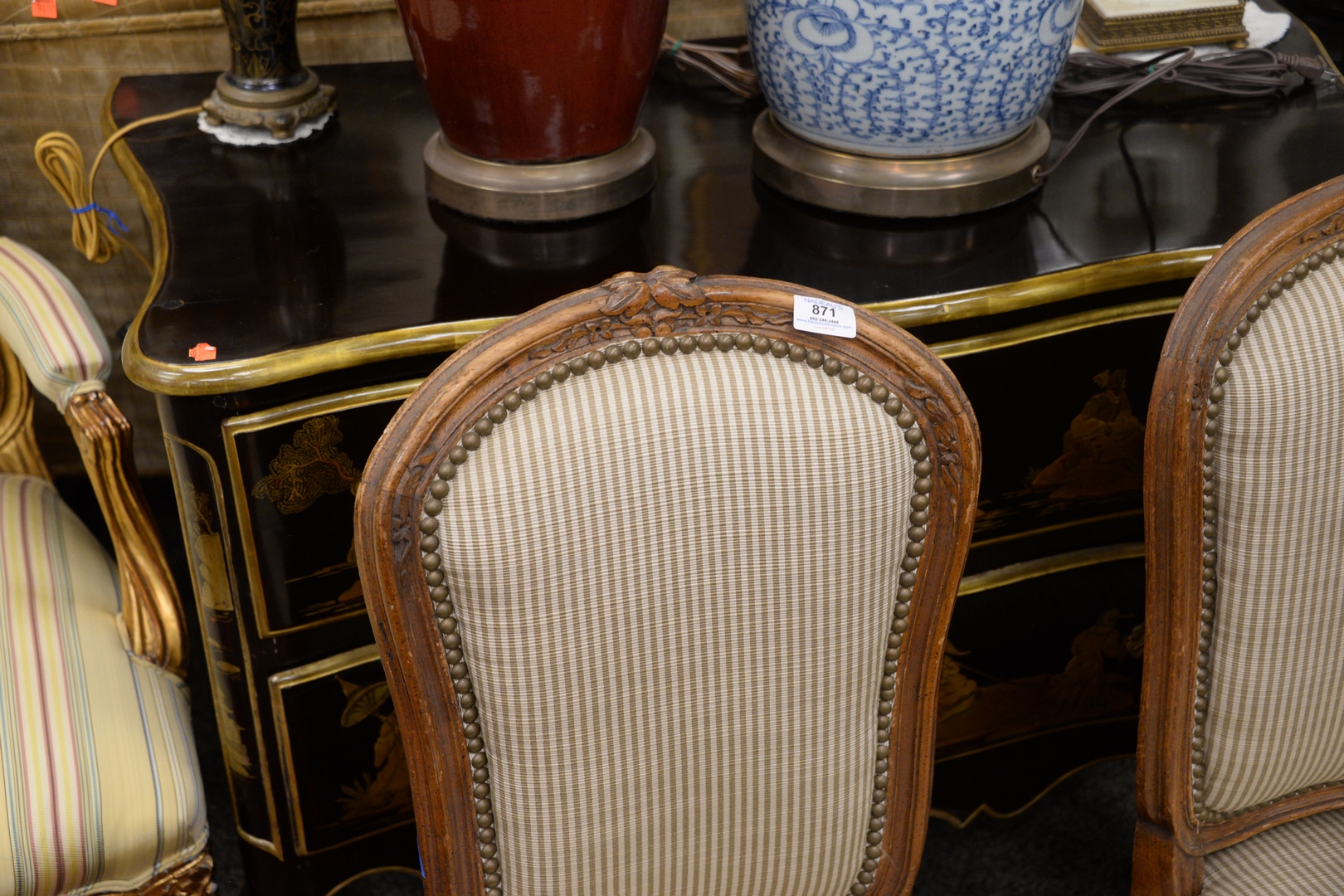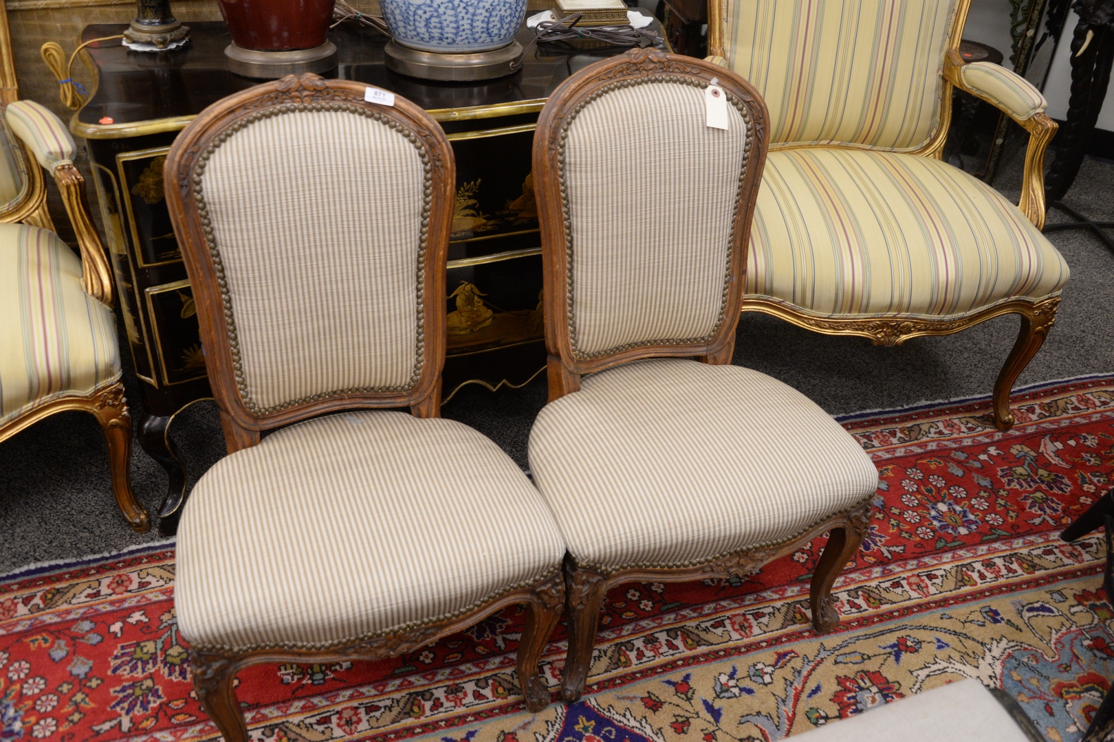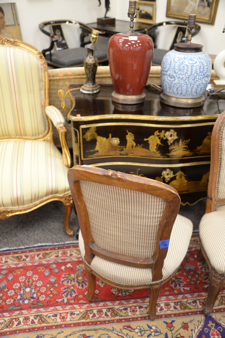 Pair of Louis XV Style Slipper Chairs, height 34 inches, seat height 16 inches, width 20 inches.