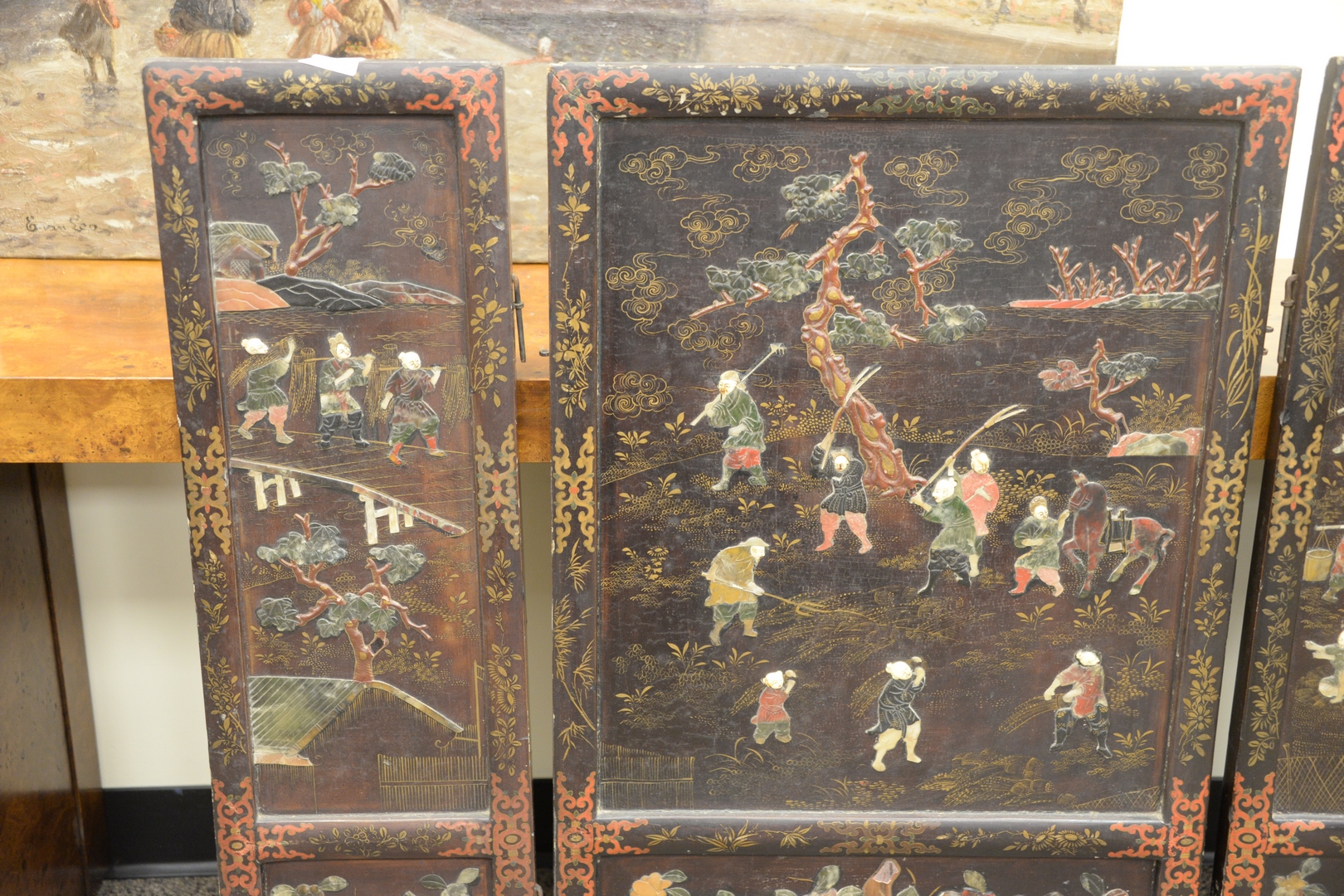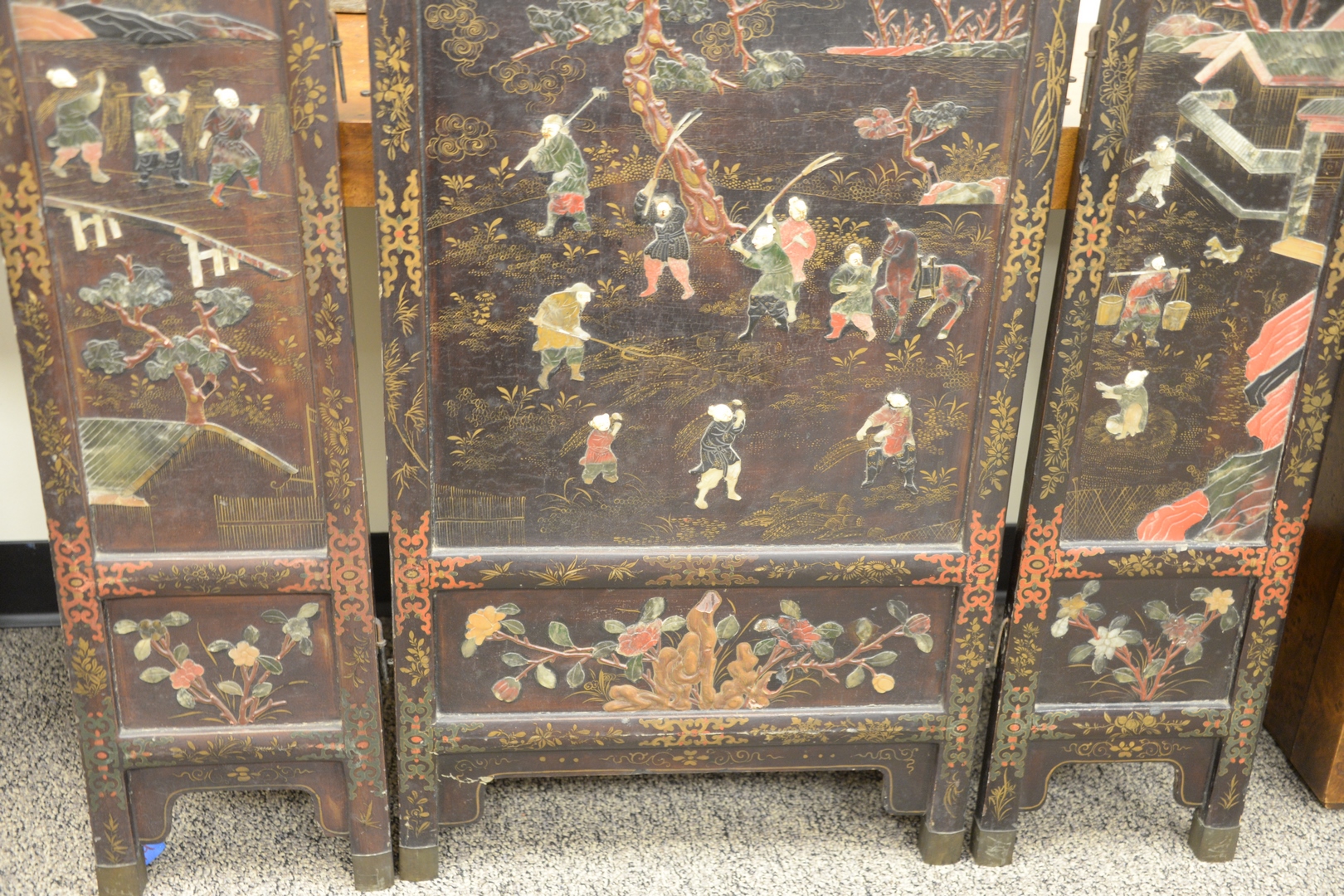 Lot 876: Three Panel Screen, each panel with hardstone figures and trees, height 34 1/2 inches, length 37 1/2 inches.