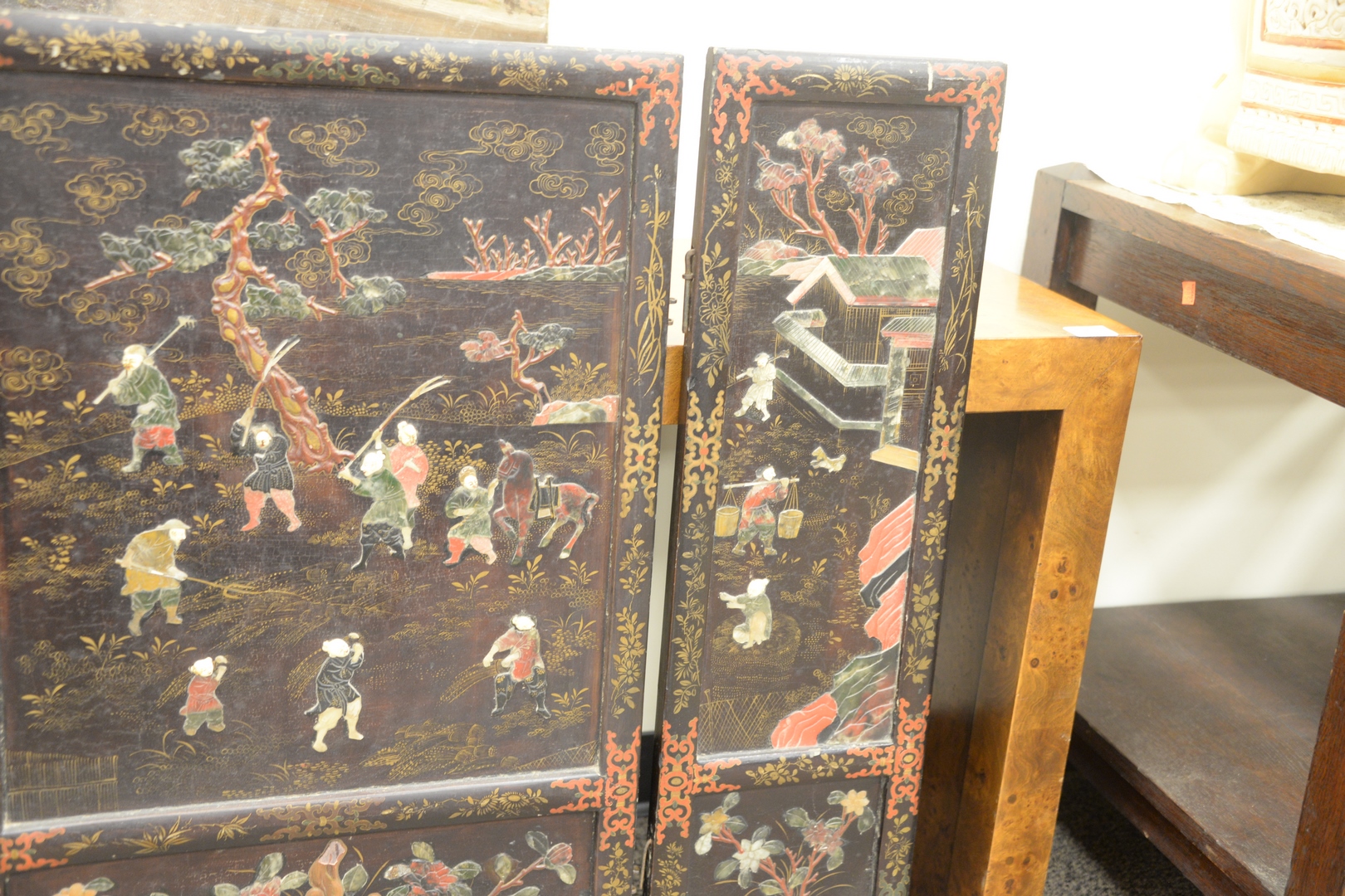 Three Panel Screen, each panel with hardstone figures and trees, height 34 1/2 inches, length 37 1/2 inches.