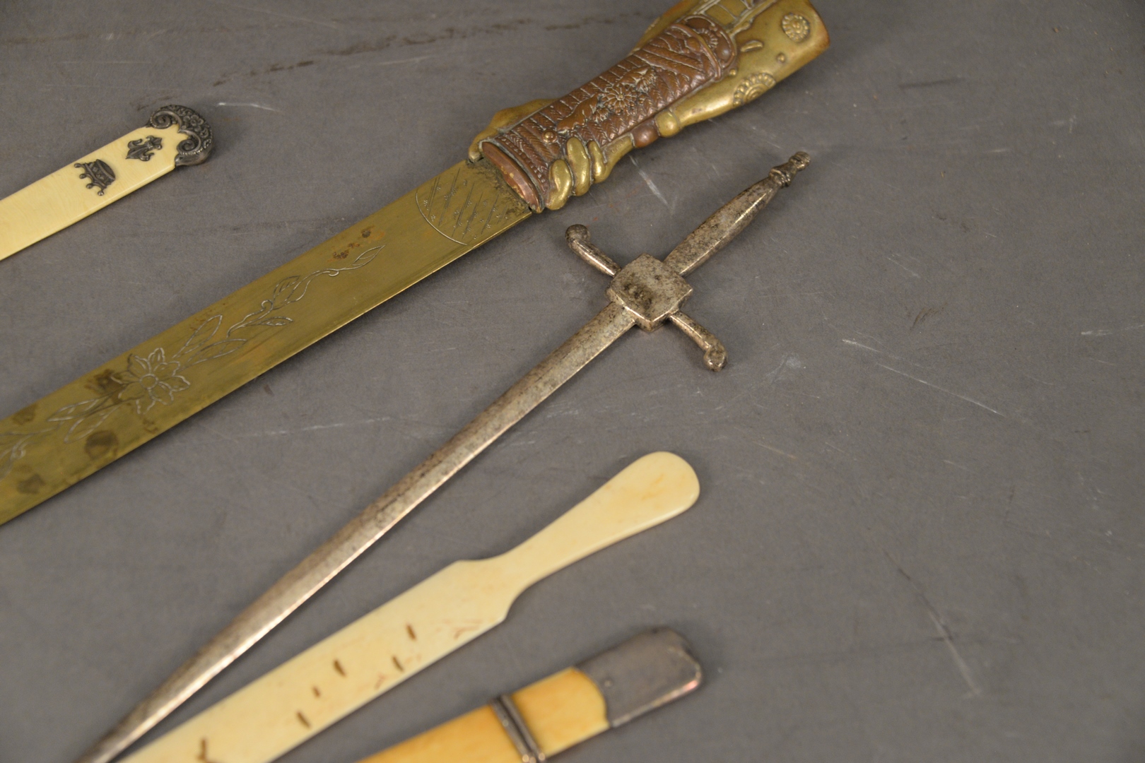 Lot 878: Six Piece Group of Brass and Bone Page Turners, one brass in the form of a samurai sword with hand, longest 15 1/2 inches.