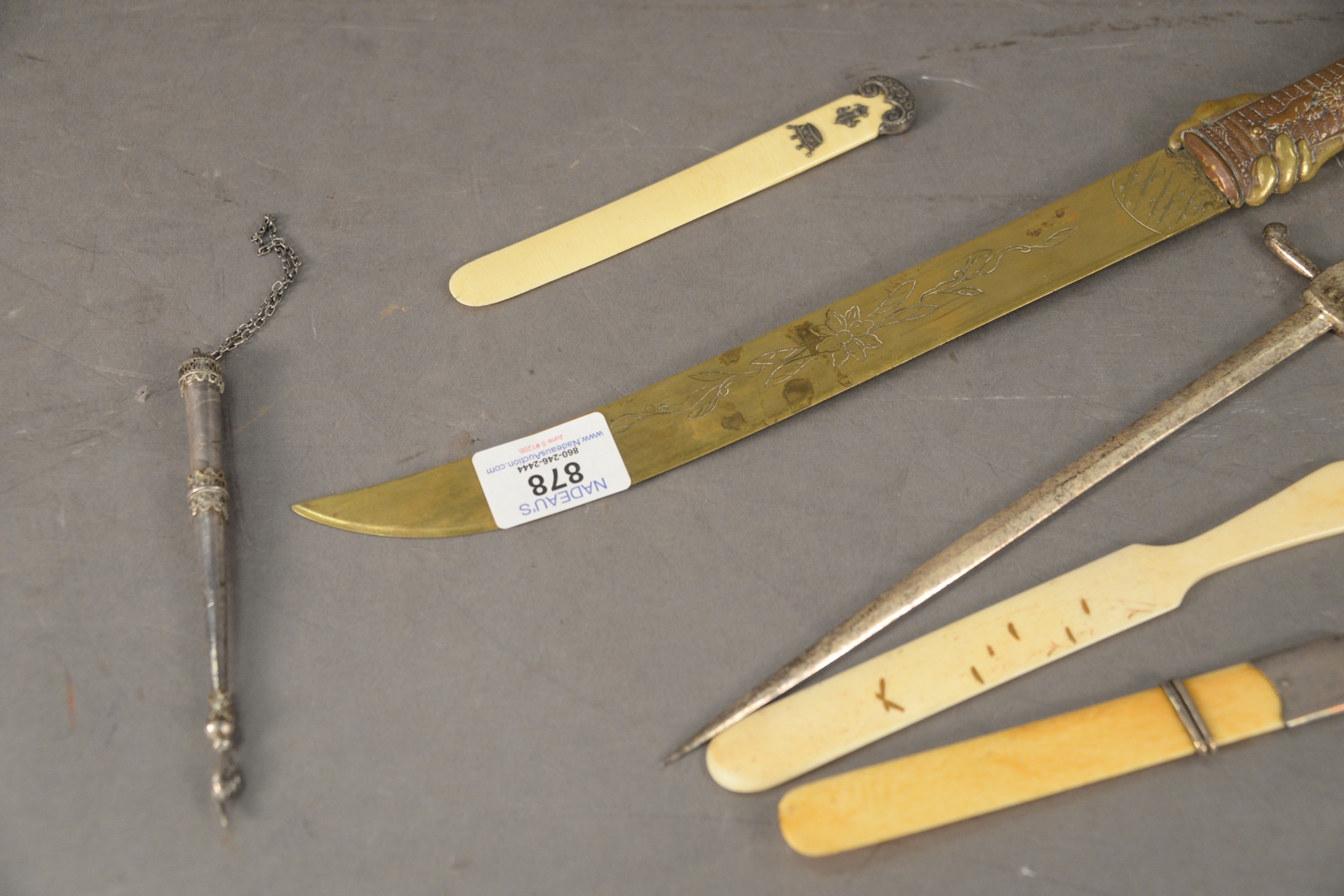 Six Piece Group of Brass and Bone Page Turners, one brass in the form of a samurai sword with hand, longest 15 1/2 inches.