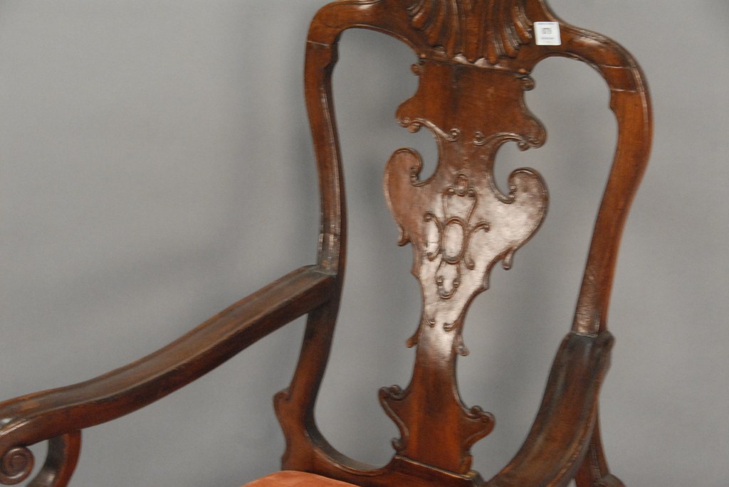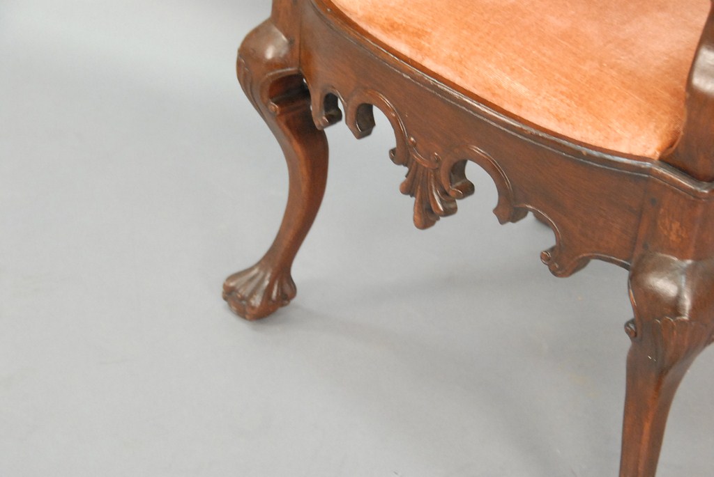 Lot 879: Walnut armchair with carved back, carved skirt, cabriole legs, and ball and claw feet, probably Continental.ht. 46in.