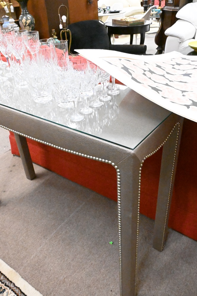 Contemporary Upholstered Hall Table, having tack edge, height 3 1/2 inches, top: 15″ x 43″.