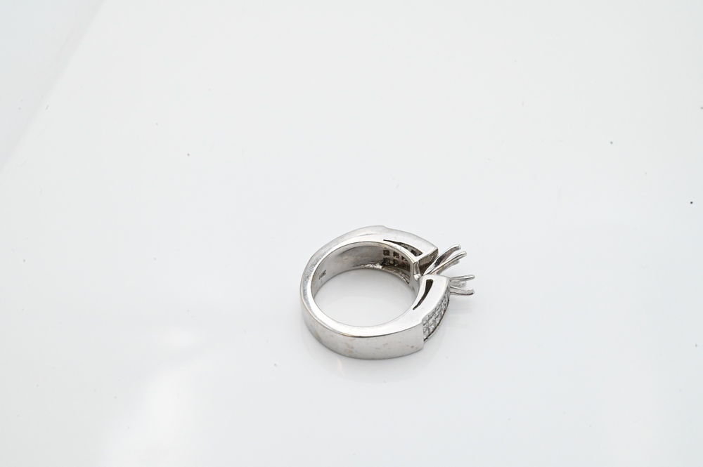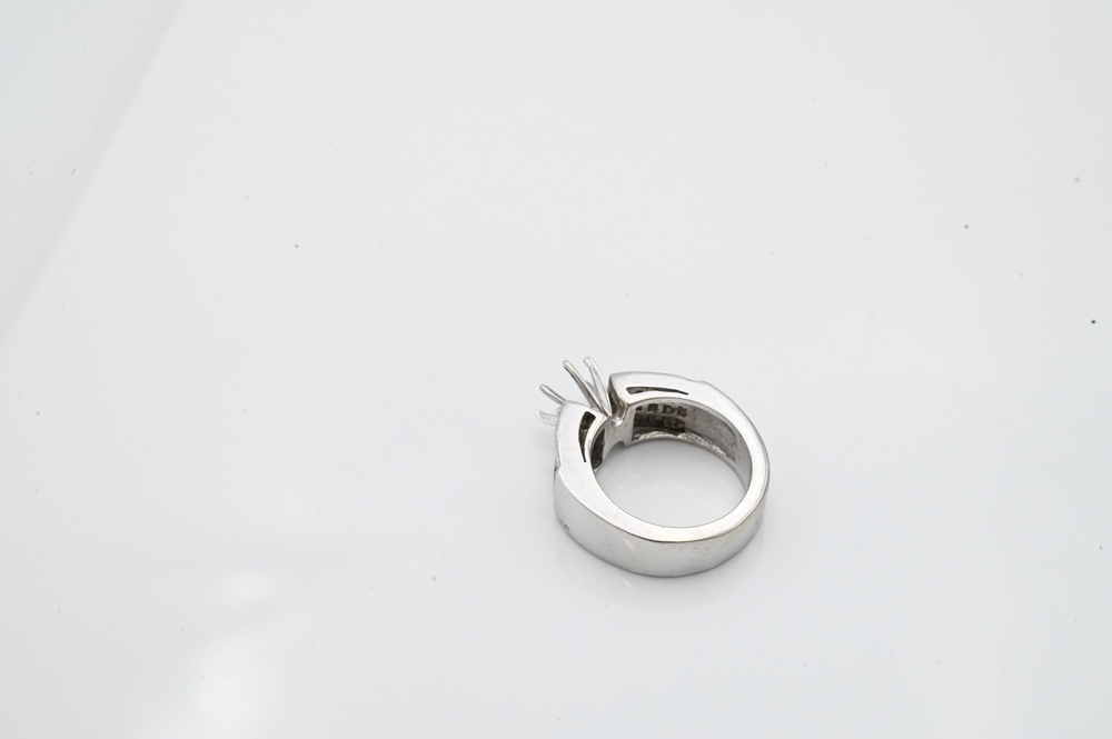 Lot 88: 14 Karat White Gold Ring Setting, no center diamond, 15 diamonds on either side of center, size 5 1/2, 10 grams.