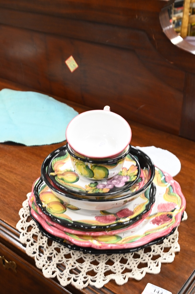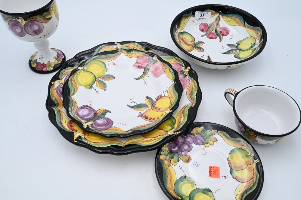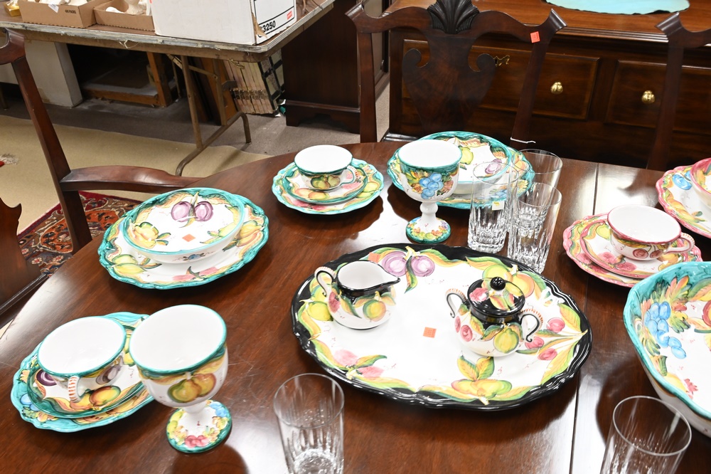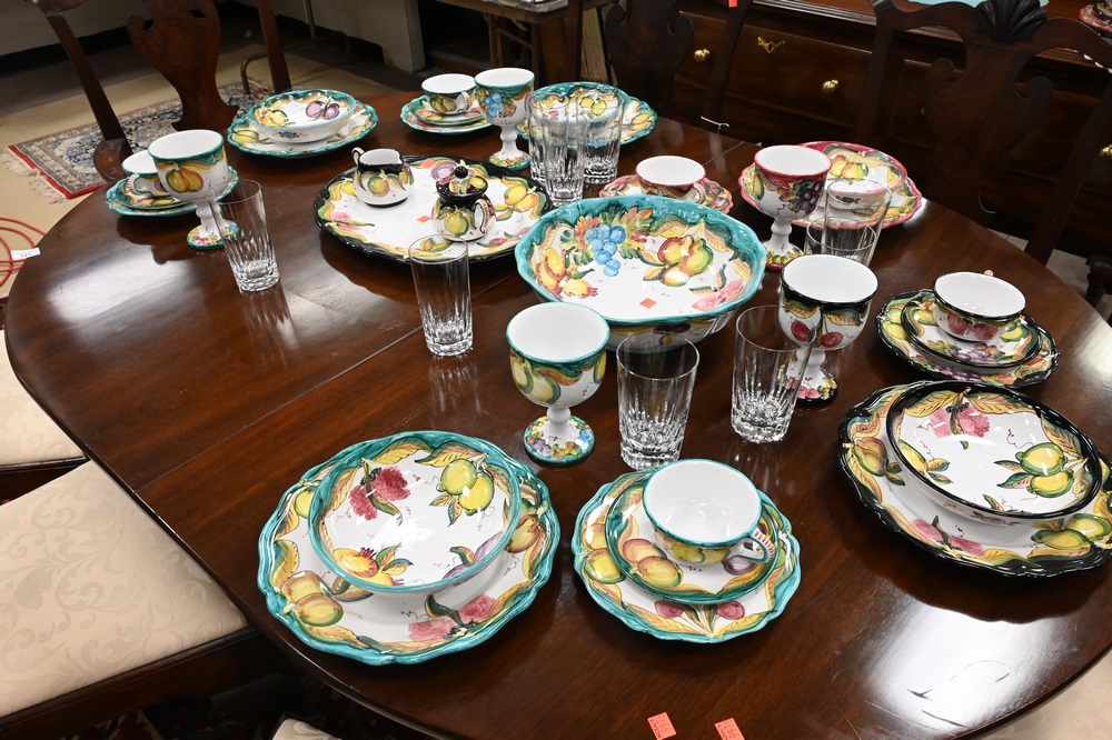 Lot 88: 46 Piece Set of Italian Pottery, to include 8 goblets, 8 tea cups, 8 saucers, 8 salad plates, 8 dinner plates, 7 soup bowls, along with 3 serving pieces, some marked ‘Dip a Mano’ to the underside, dinner plate diameter 10 1/2 inches.
