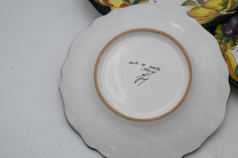 46 Piece Set of Italian Pottery, to include 8 goblets, 8 tea cups, 8 saucers, 8 salad plates, 8 dinner plates, 7 soup bowls, along with 3 serving pieces, some marked ‘Dip a Mano’ to the underside, dinner plate diameter 10 1/2 inches.