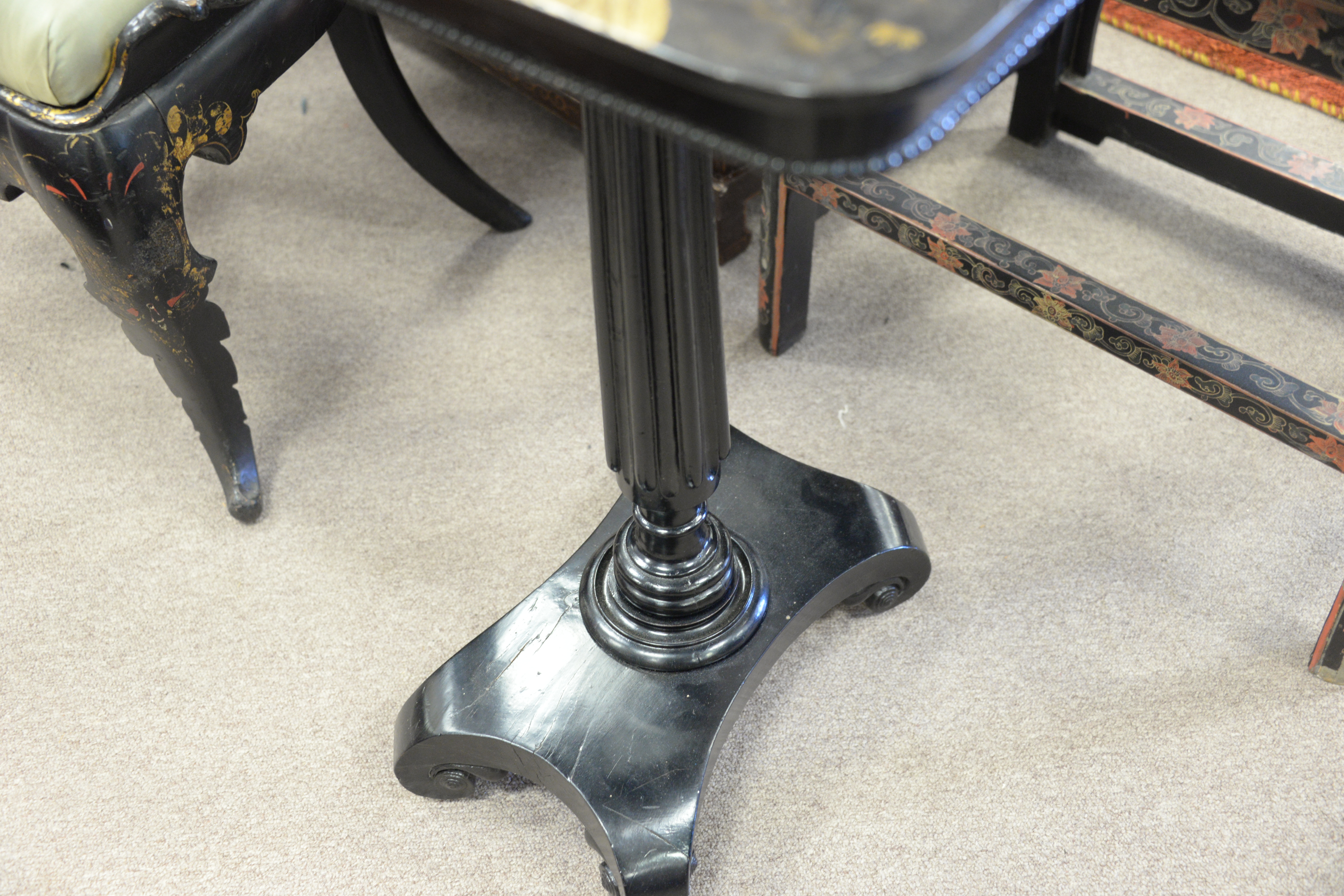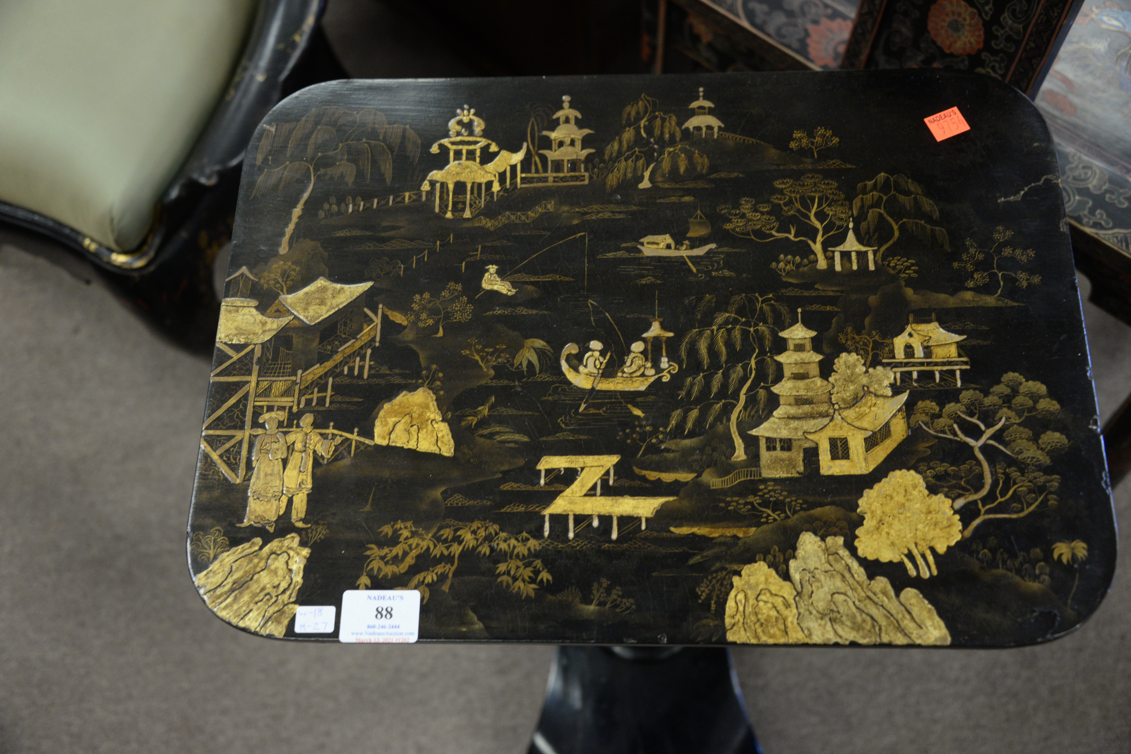Lot 88: Black Lacquered Stand, gilt chinoiserie decorated landscape scene height 27 inches, top 13 x 18.