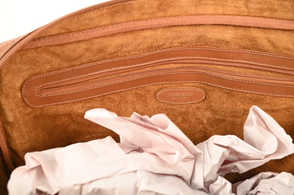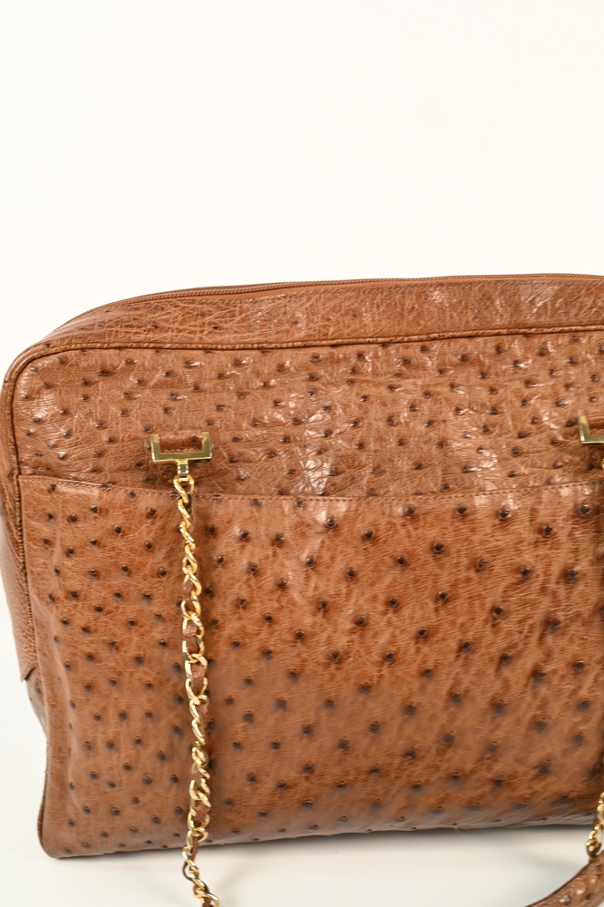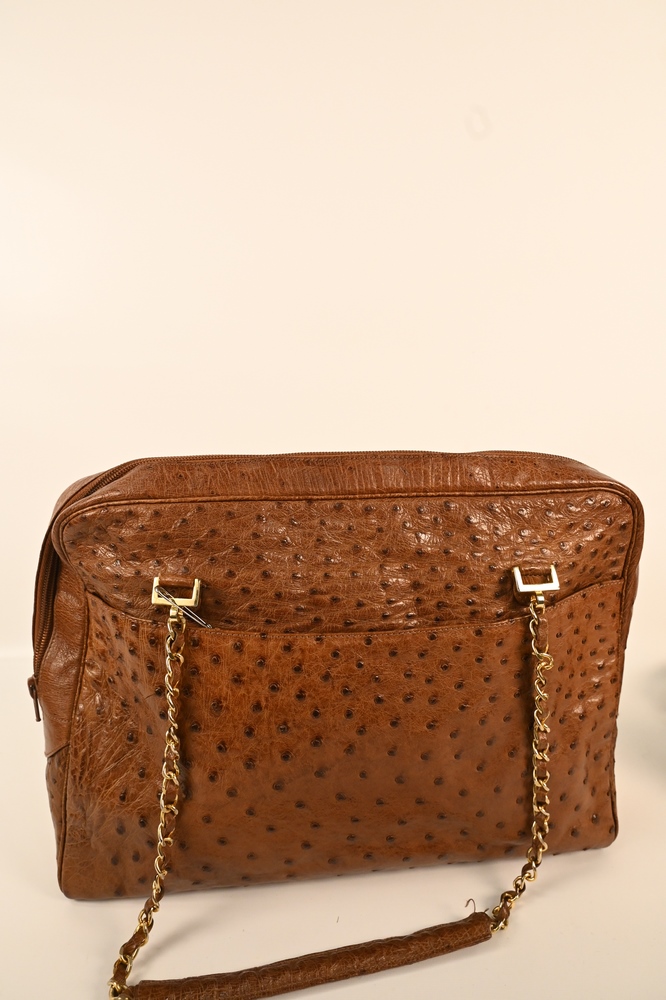 Donna Elissa Brown Ostrich Shoulder Bag, suede lined, single compartment having two interior and two exterior pockets, double chain link handle, top zip closure, good condition, leather is supple, height 10 1/2 inches, width 14 inches.